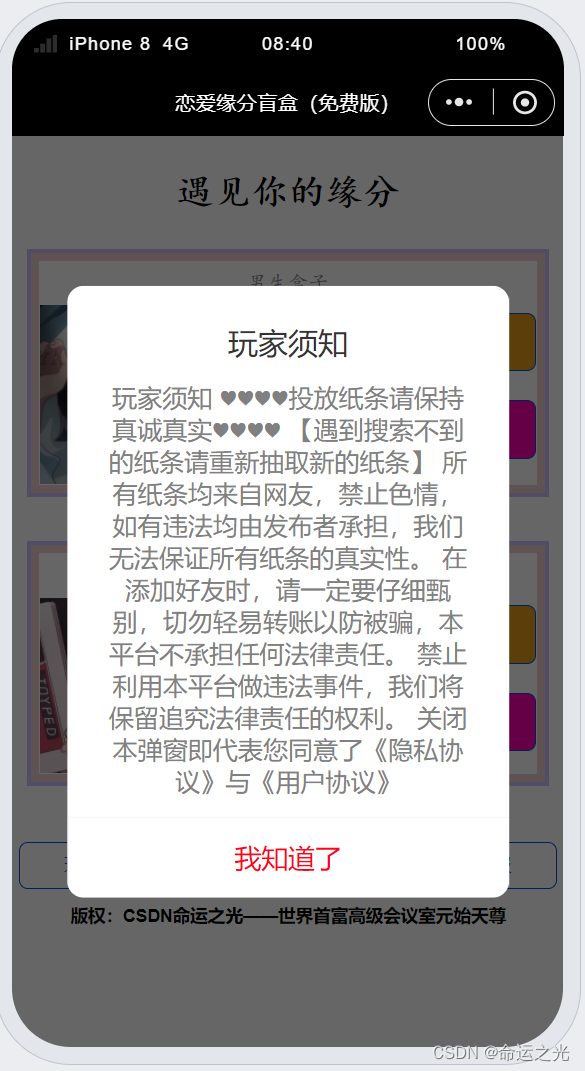 1.点击“恋爱缘分盲盒”下的按钮可弹出所需提示