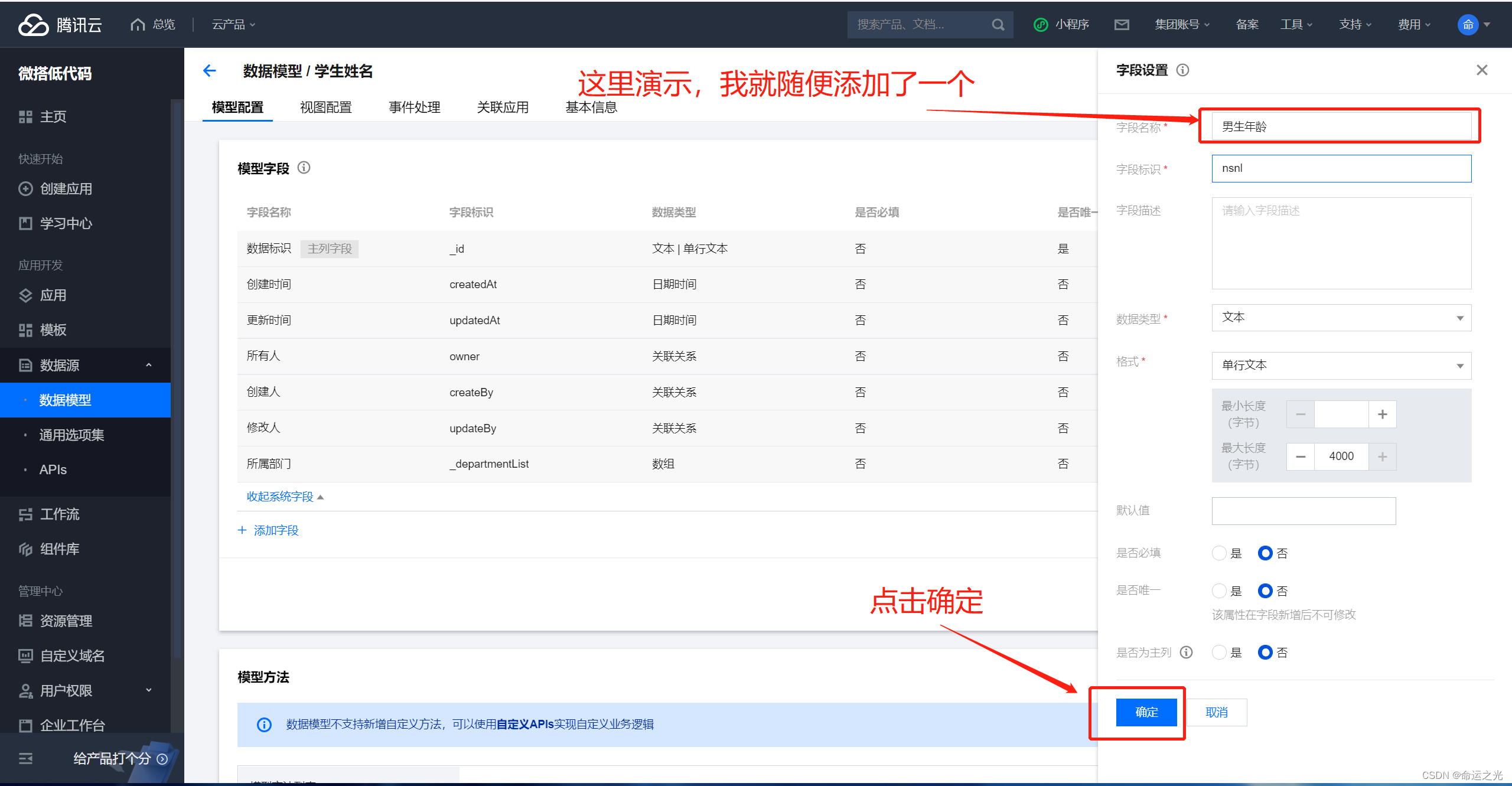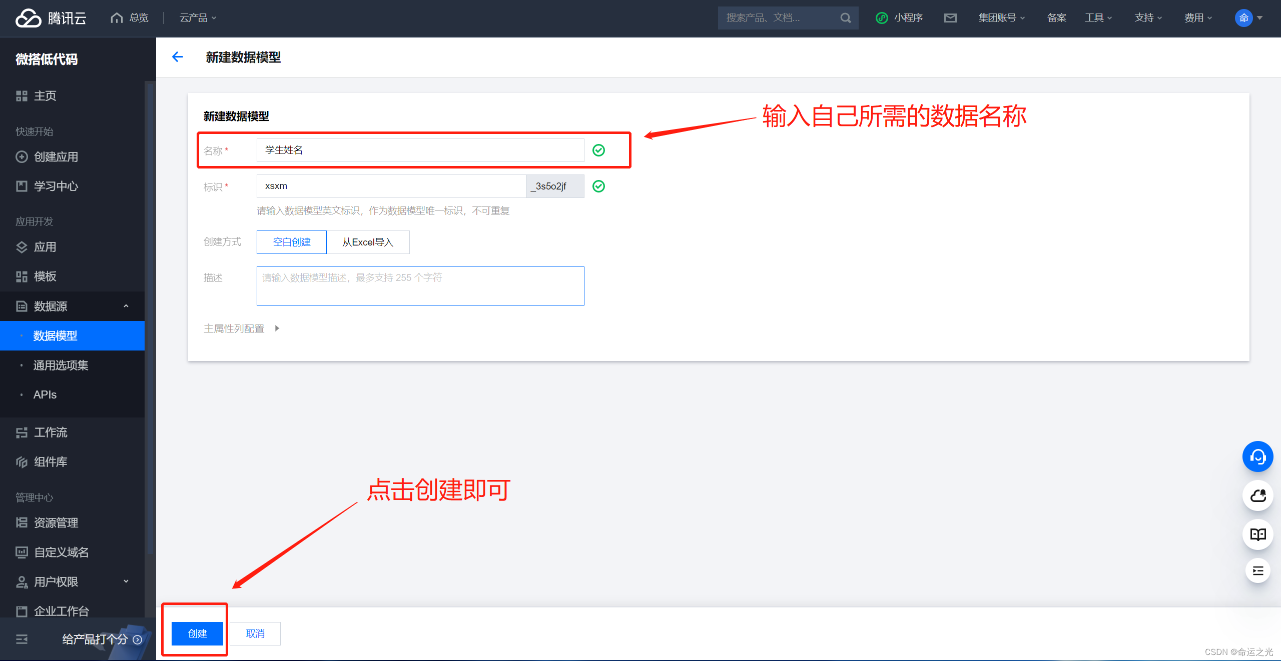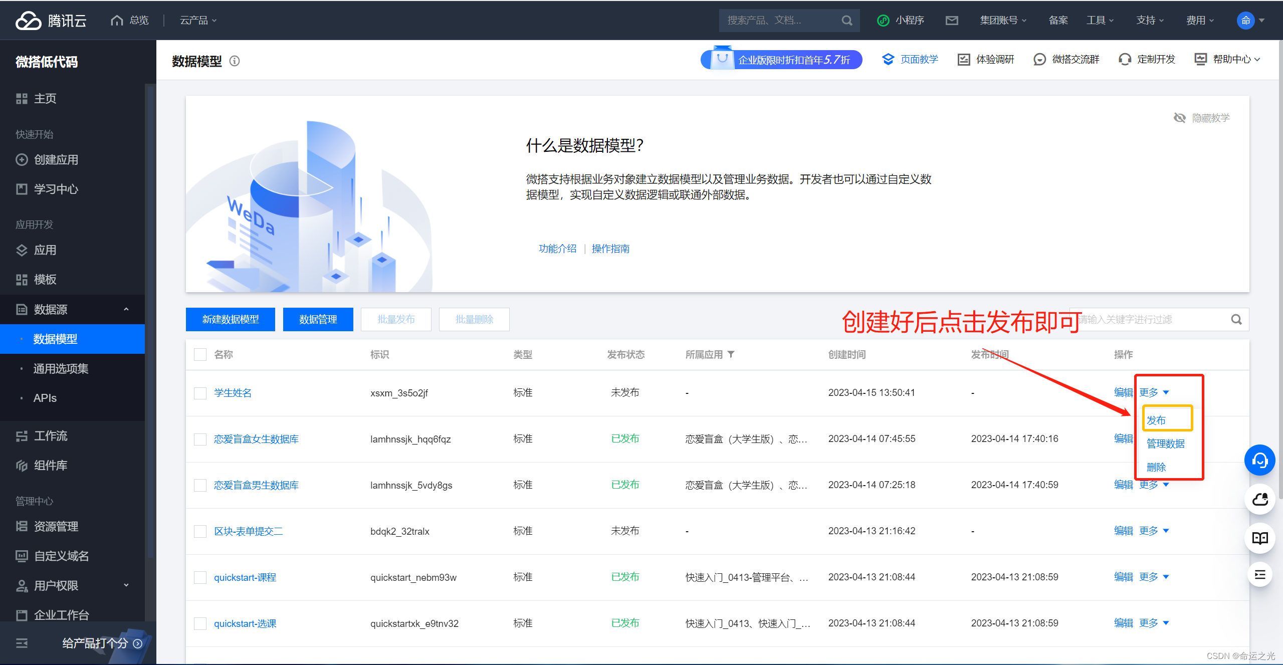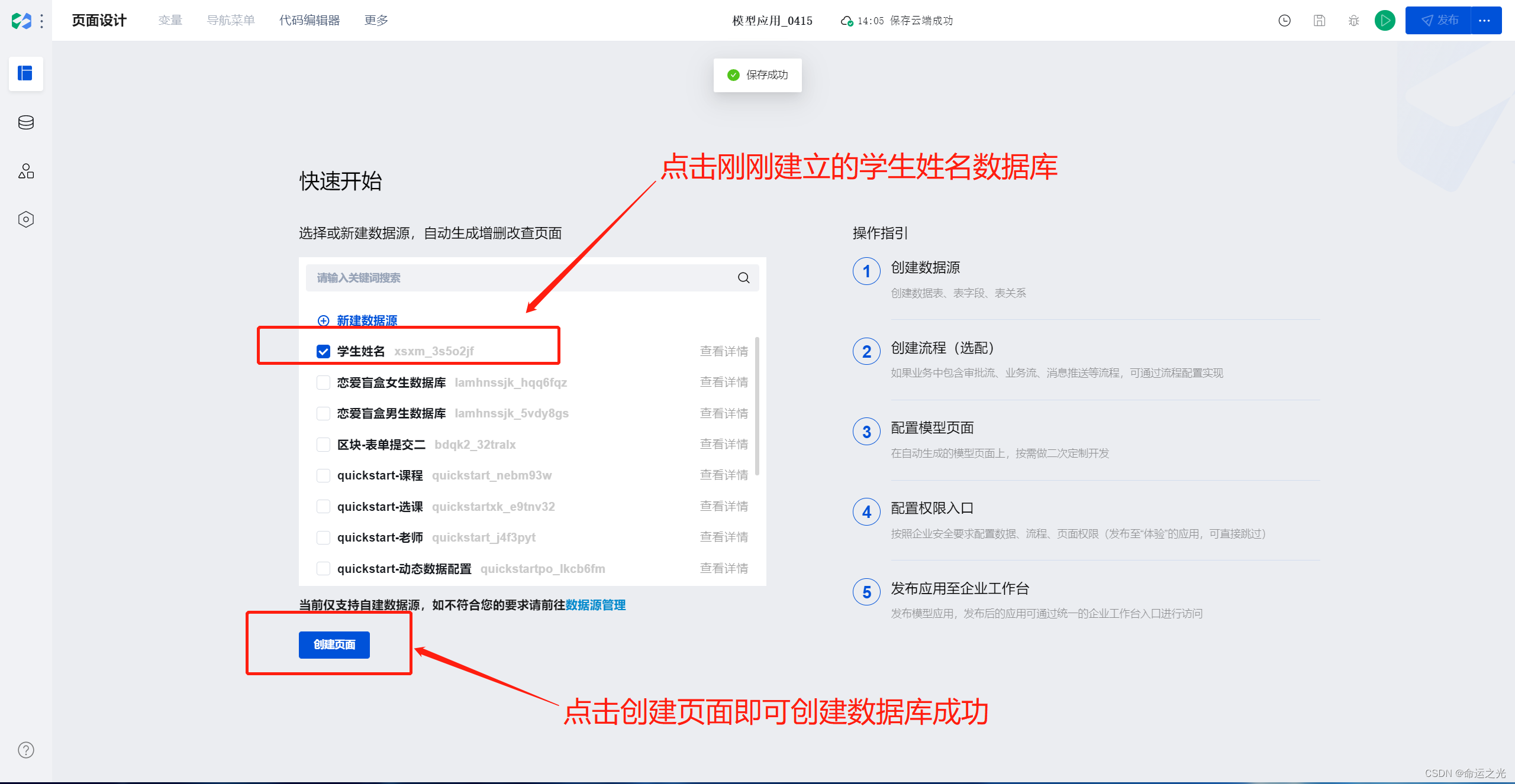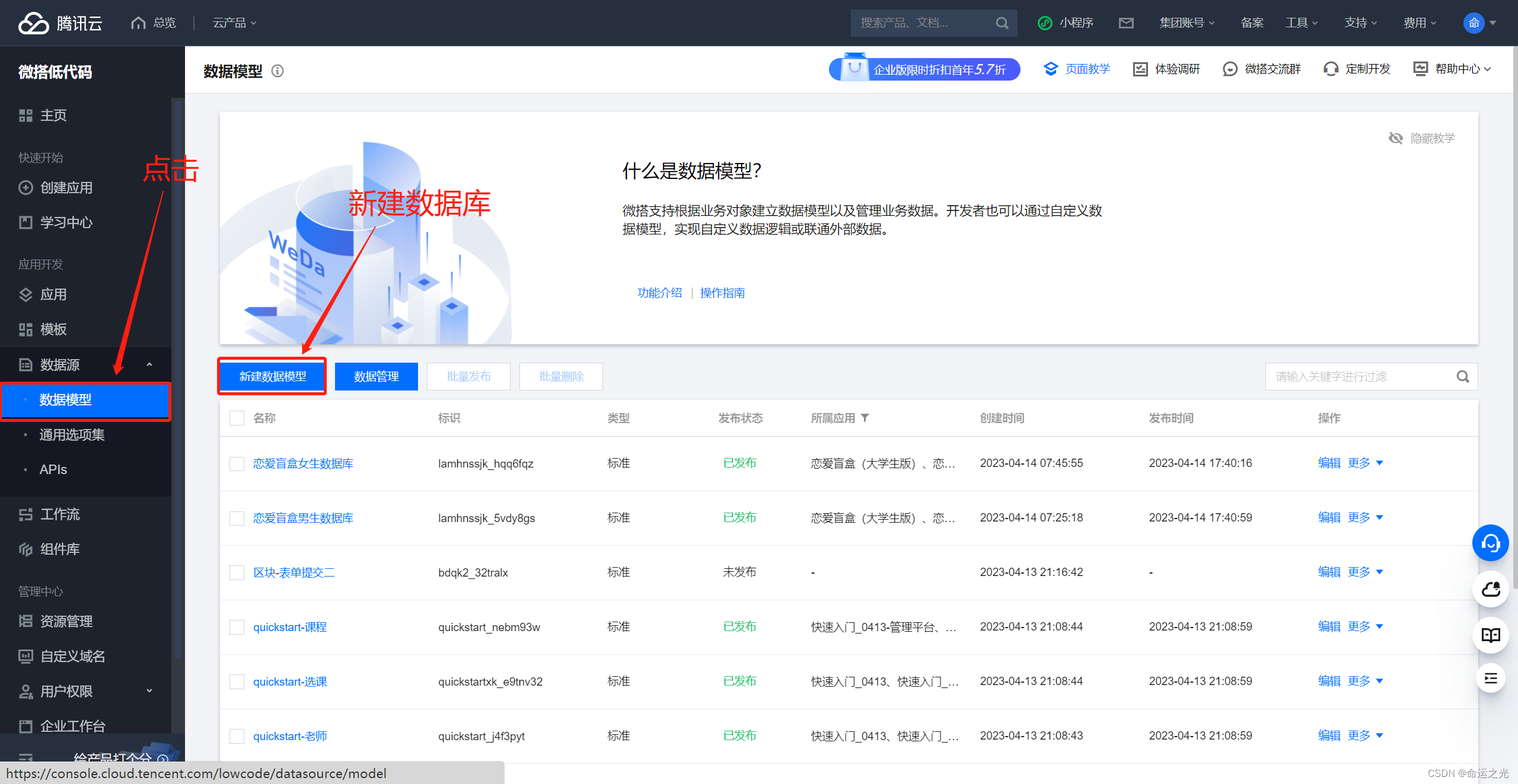 这里不要有什么犹豫,就是点击选择刚刚建立的数据库就行,微搭平台会直接导入你之前建好的数据库,然后你就可以直接无脑使用了