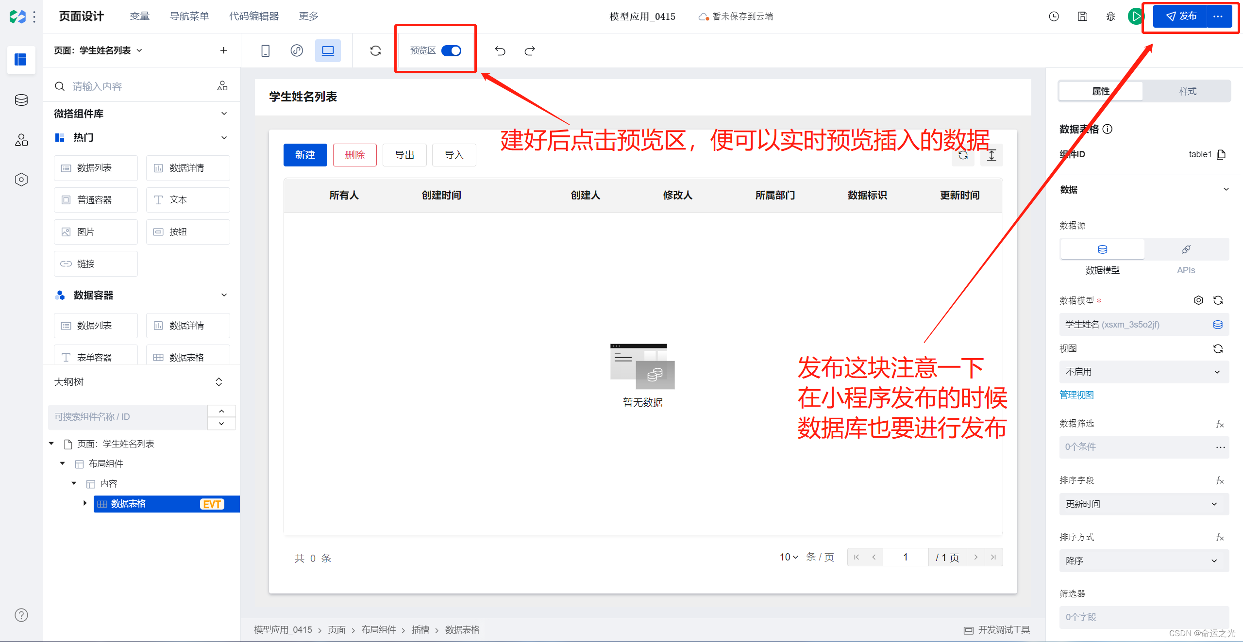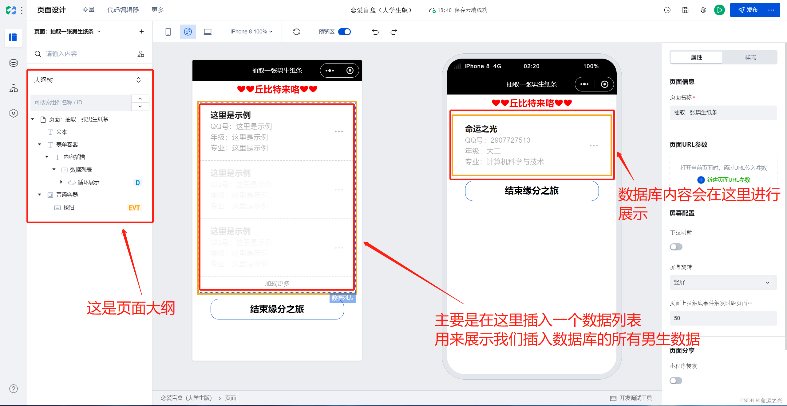 只需使用一个将数据列表组件拖拽过来即可完成这一页面的80%的设置,剩下的就剩按钮的响应,根据需求我们这里是点击切换到上一页面,实现方法和之前讲的一样