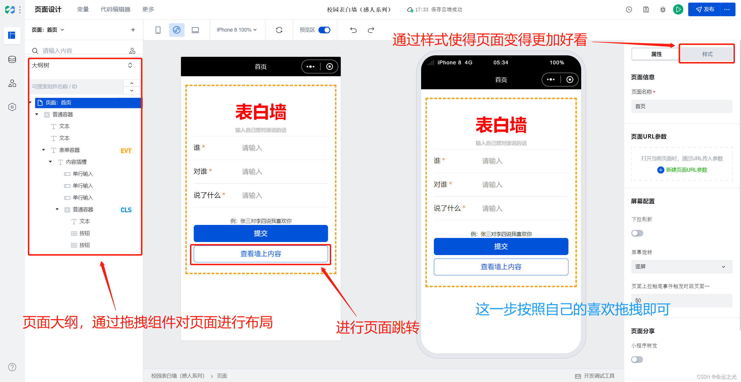 在他的博客中,他分享了很多微搭低代码开发的注意事项和技术细节,这让我对微搭的认识更加深入和全面。在他的指导下,我成功地使用微搭技术搭建了一款校园表白墙小程序,并将其成功上线发布。这对我来说是一次非常有意义的经历,也让我更加了解了微信小程序开发的方方面面。