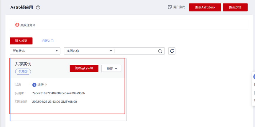 登录Astro网页https://console.huaweicloud.cn/appcube/?region=cn-north-4#/home;