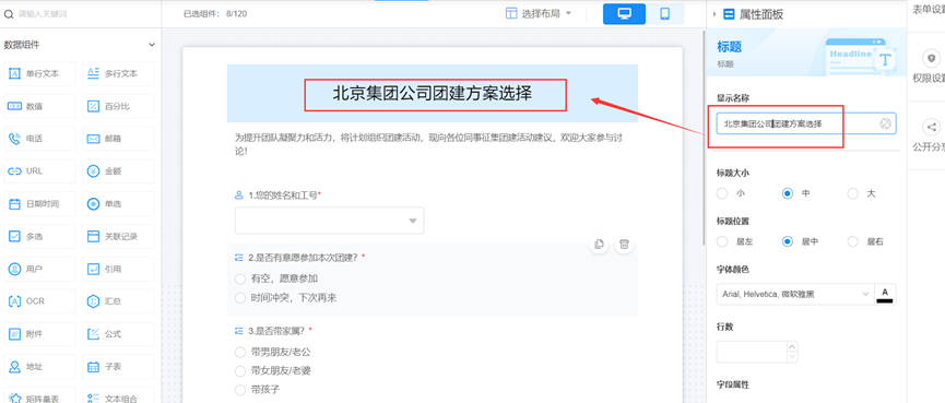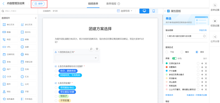 根据公司团建需要,依次增加表单填写内容,同时可为表单编辑并选择颜色,如下图;