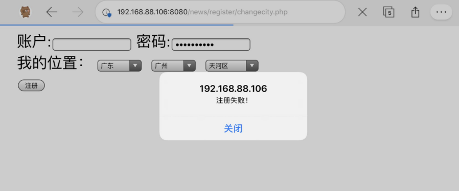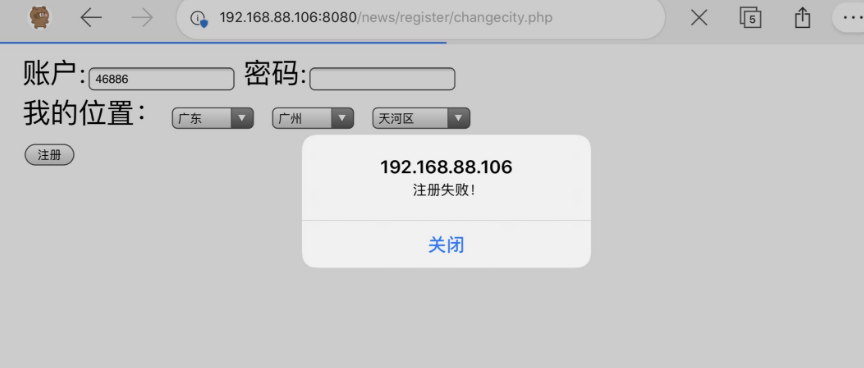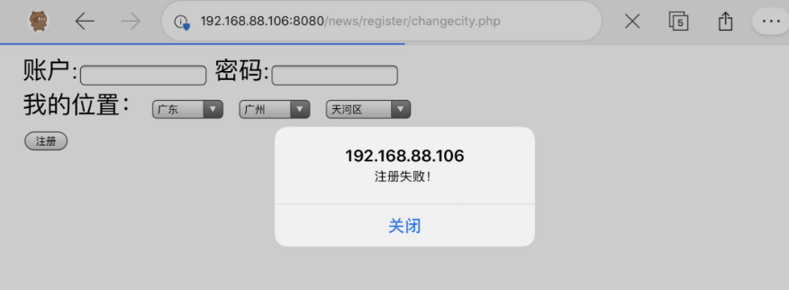 运行浏览器,打开注册页面,仅输入省市区信息,返回注册失败。