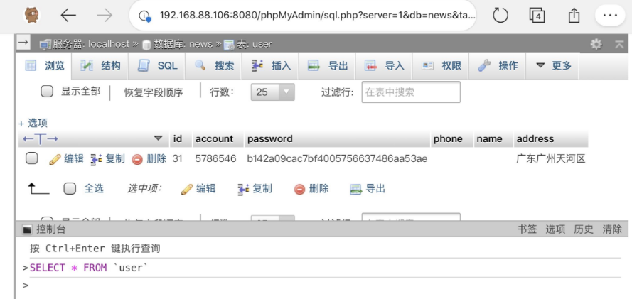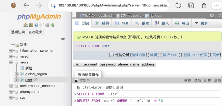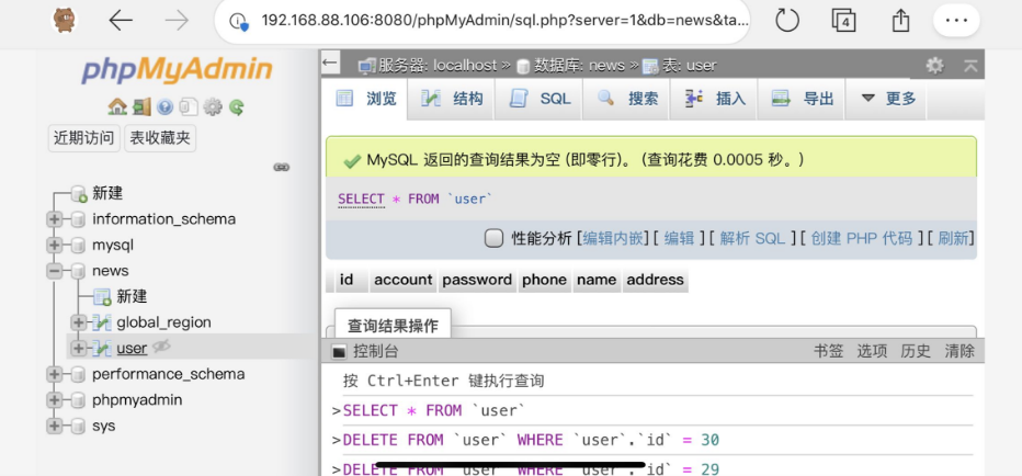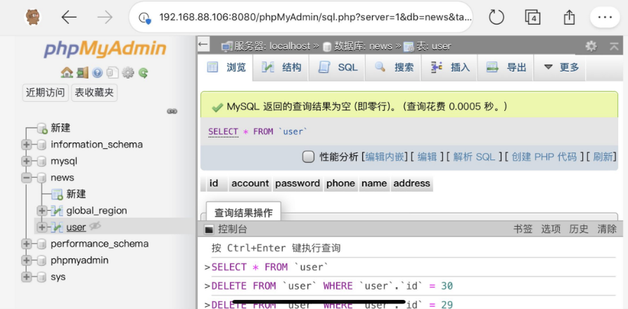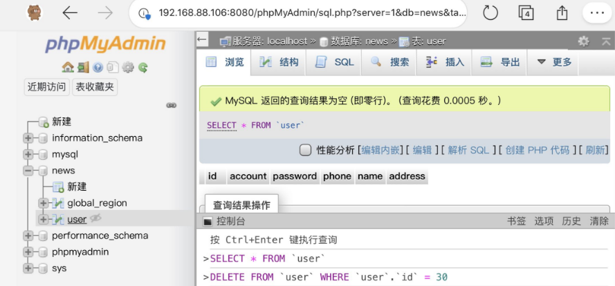 打开数据库,查询news数据库下的user表信息,可以看出空空如也。