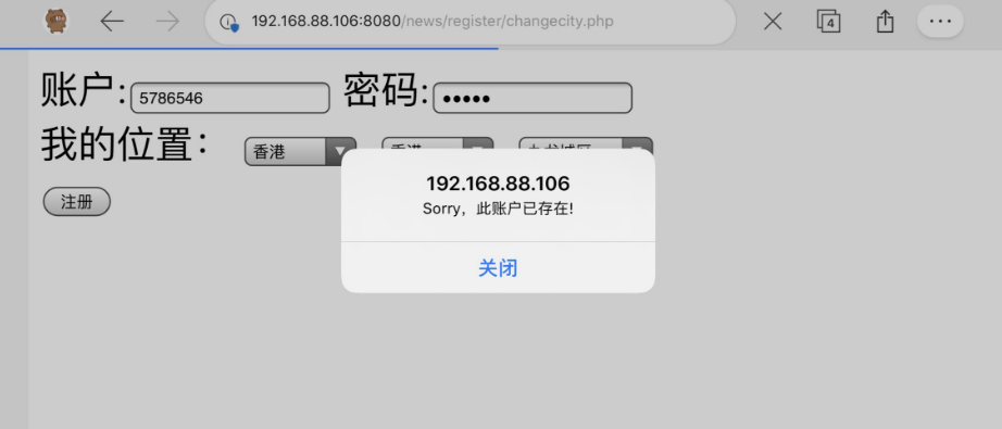 再次返回注册页面,输入刚刚注册的账户名,并写上其他信息,返回此账户已存在,再次查询数据库,用户注册信息并未改动。