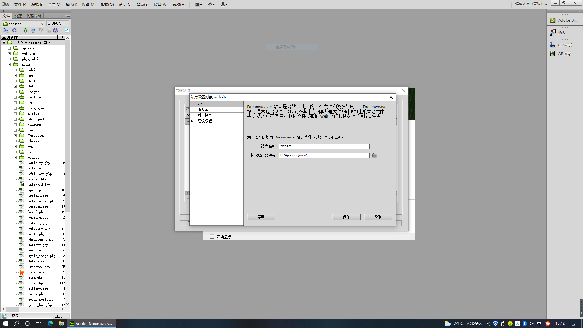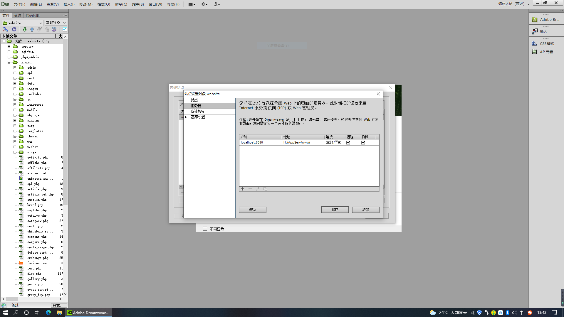 3.启动Dreamweaver网页编辑器,建立服务器站点。