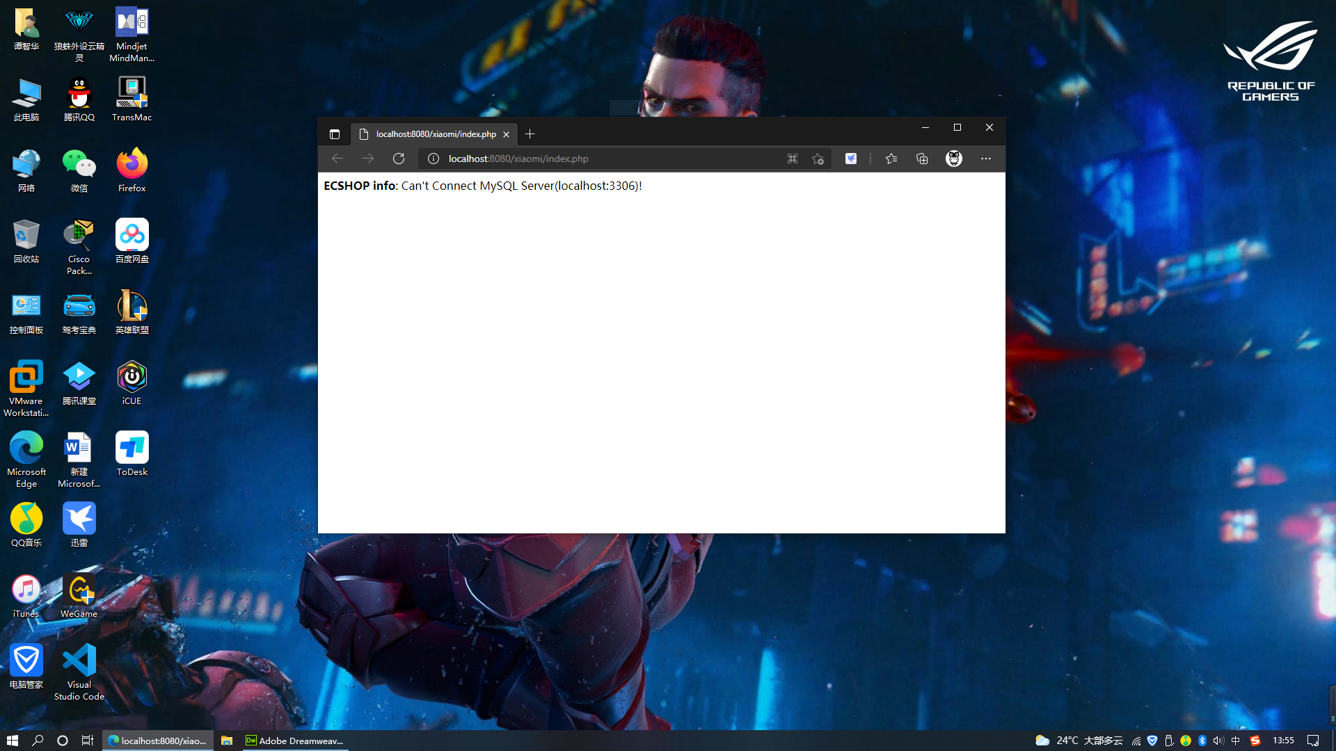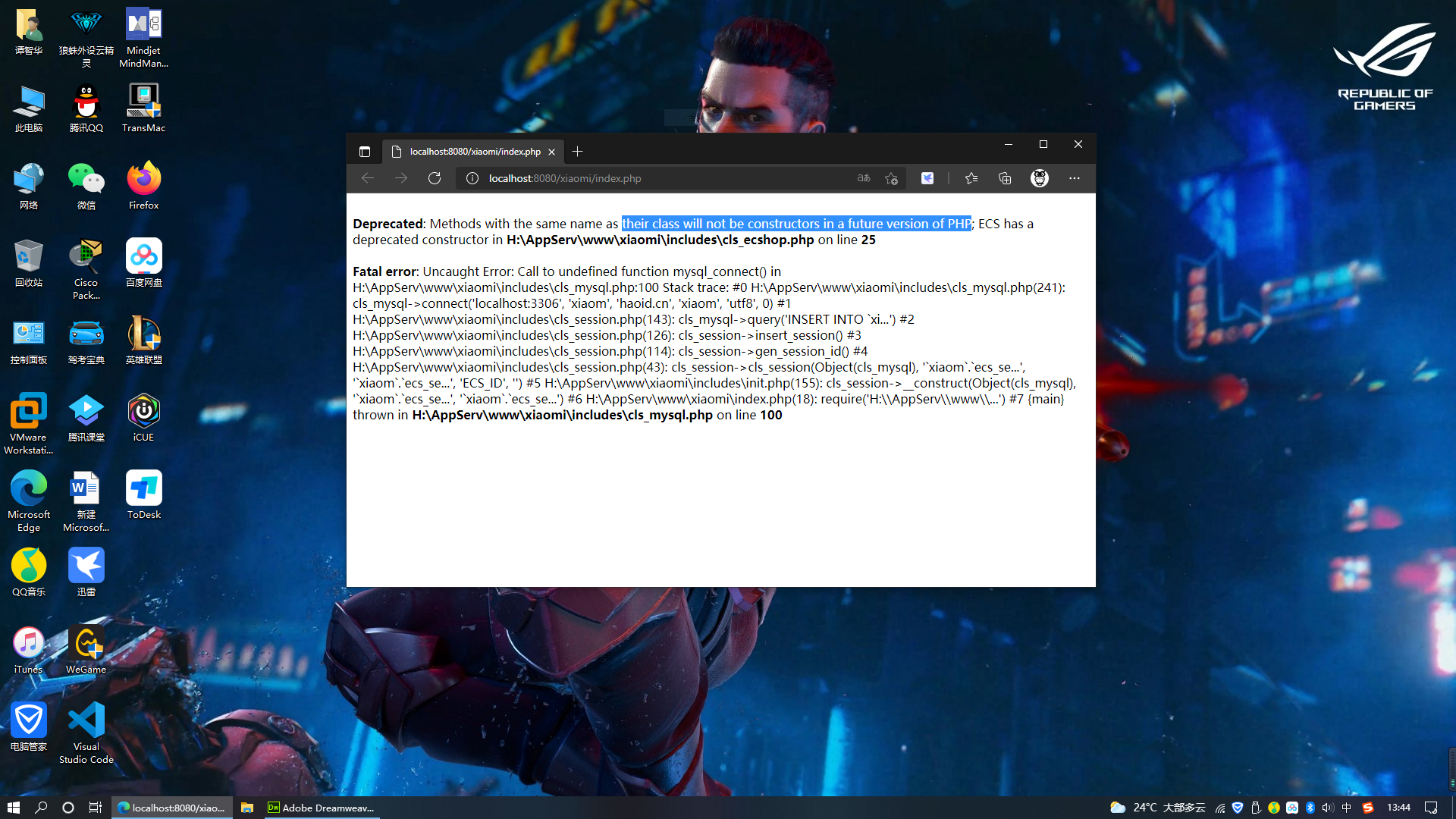 4.打开项目下的index.php,直接访问网站。 在访问页可以看出,两个问题。 ①PHP解析服务器版本过高。 ②数据库无法连接。