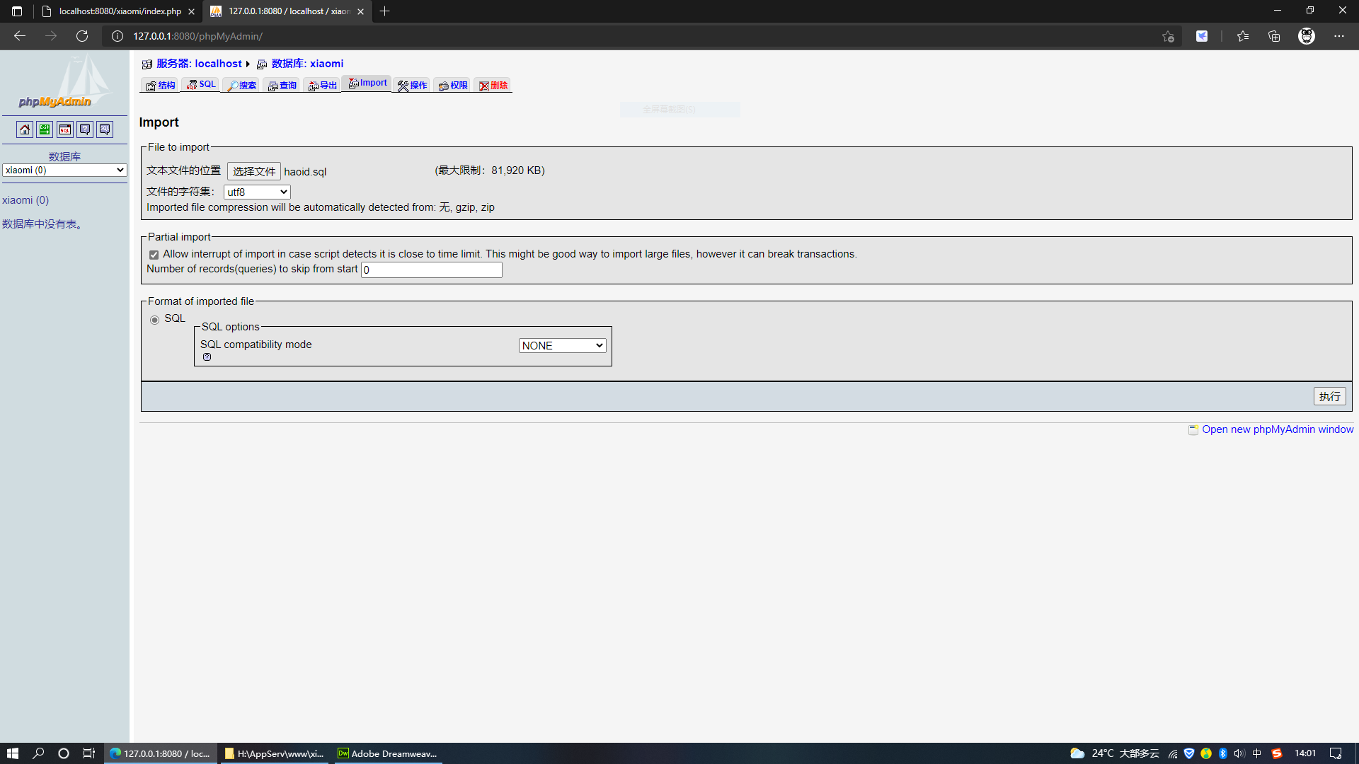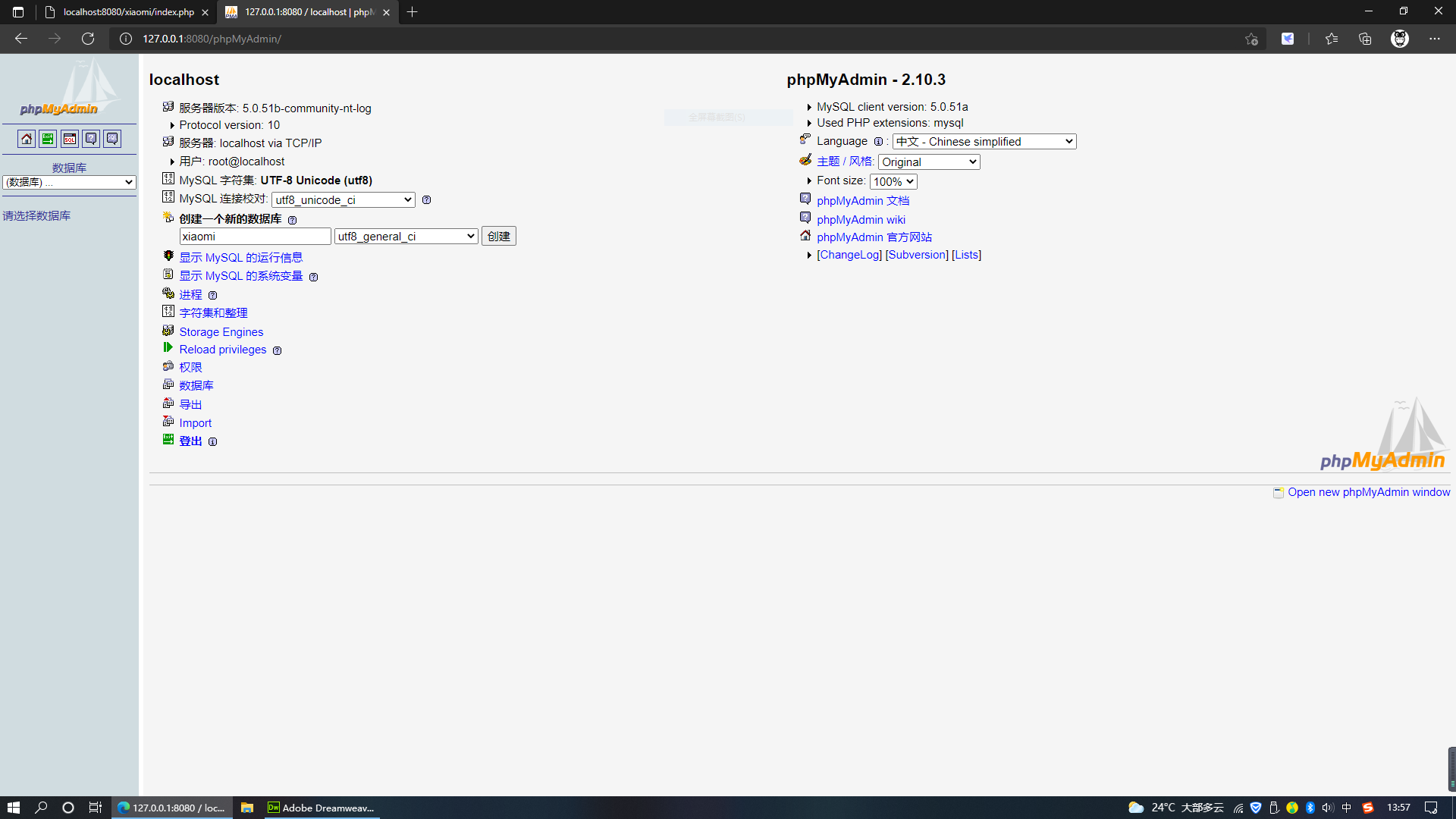 9.进入数据库后台管理页面,新建一个名为“xiaomi”的数据库。