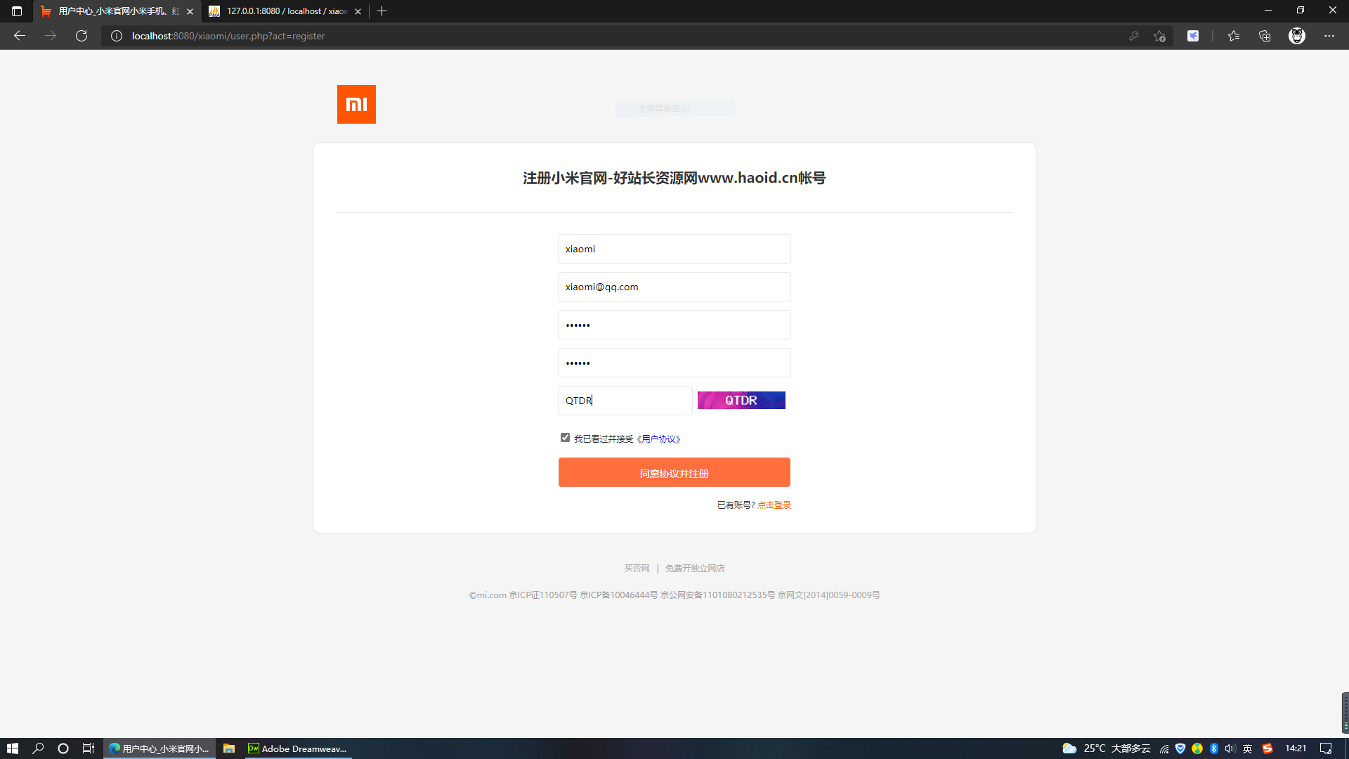 12.我们进行一次用户注册来测试前端和后端页面数据交换是否有异常。实际注册成功。