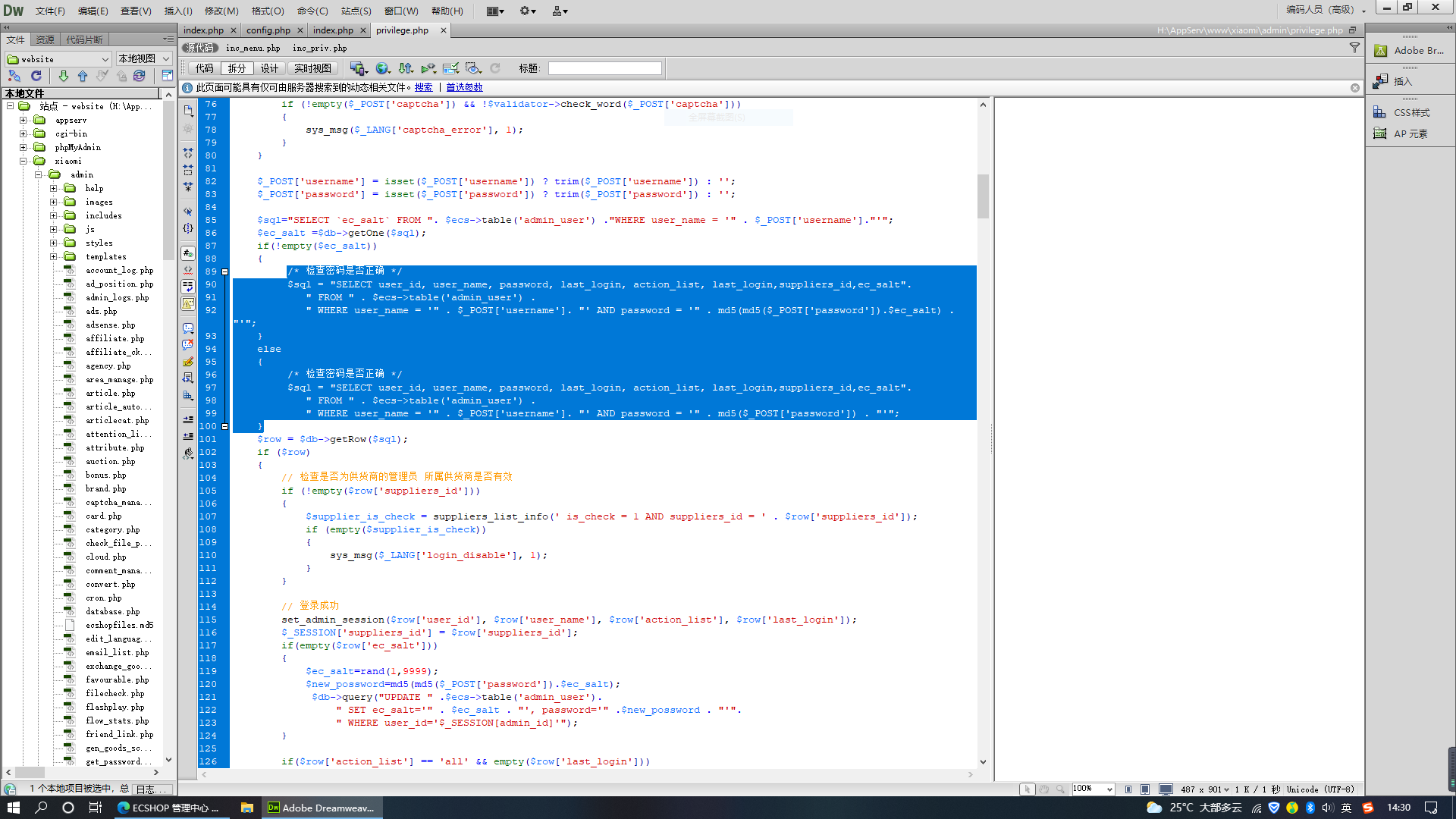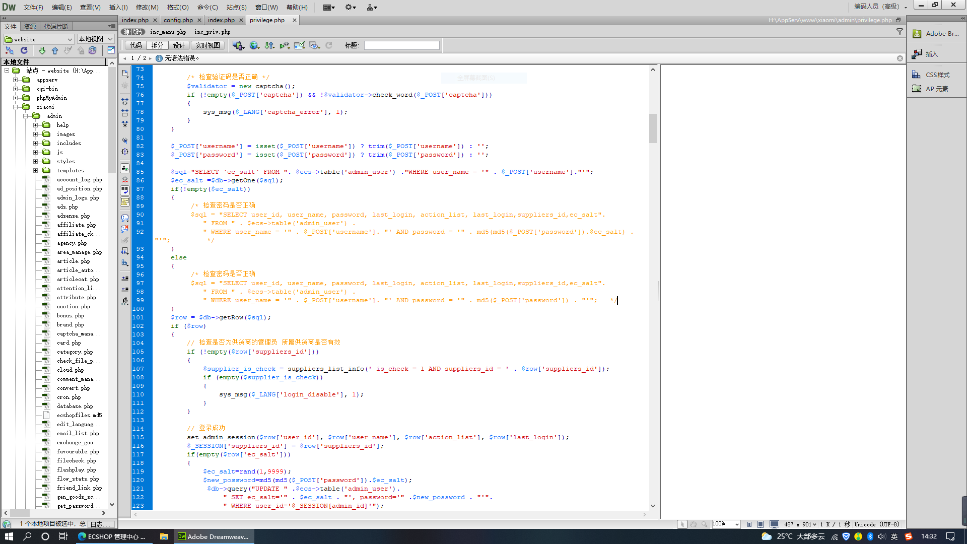 17.打开privilege.php文件,在密码验证代码设计中,果然采用了md5加密明文的方法,我们这时对已知密文复制到解密网站下解密已经不太现实,毕竟解密需要的算法和资源十分庞大。
