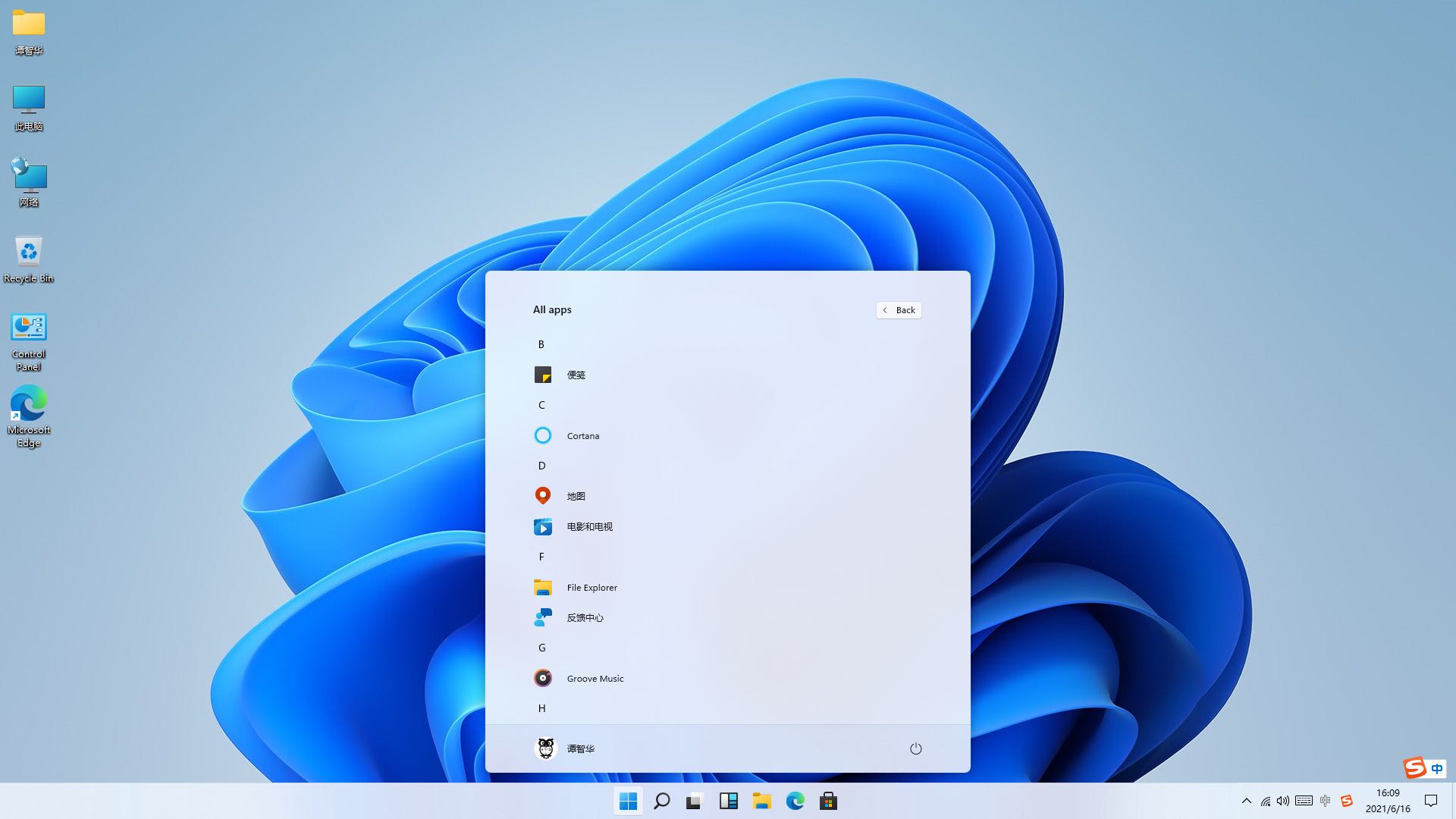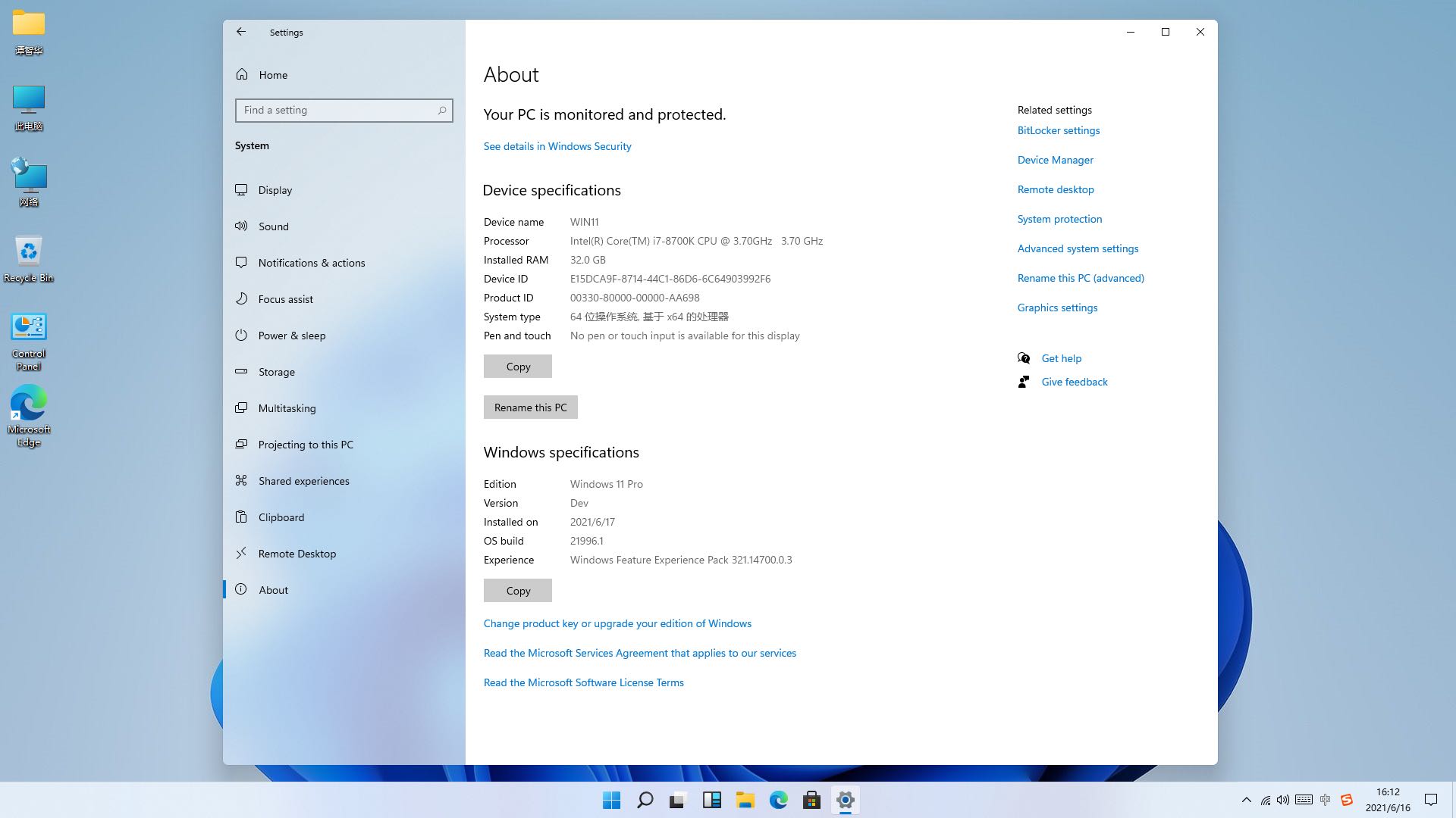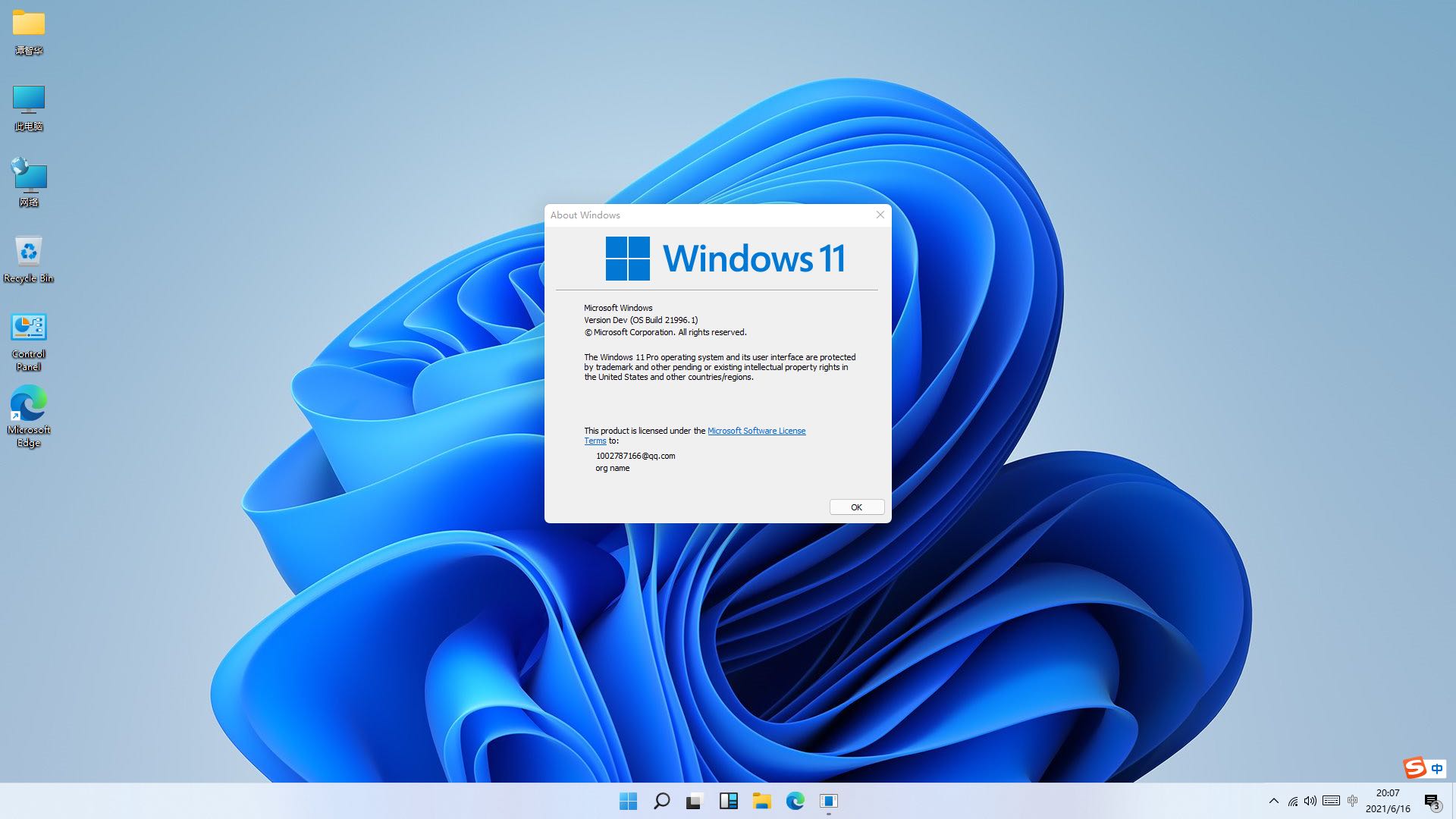 4.完成用户初始化设置,进入新系统。可以看出下一代Windows操作系统将会命名为Windows11。