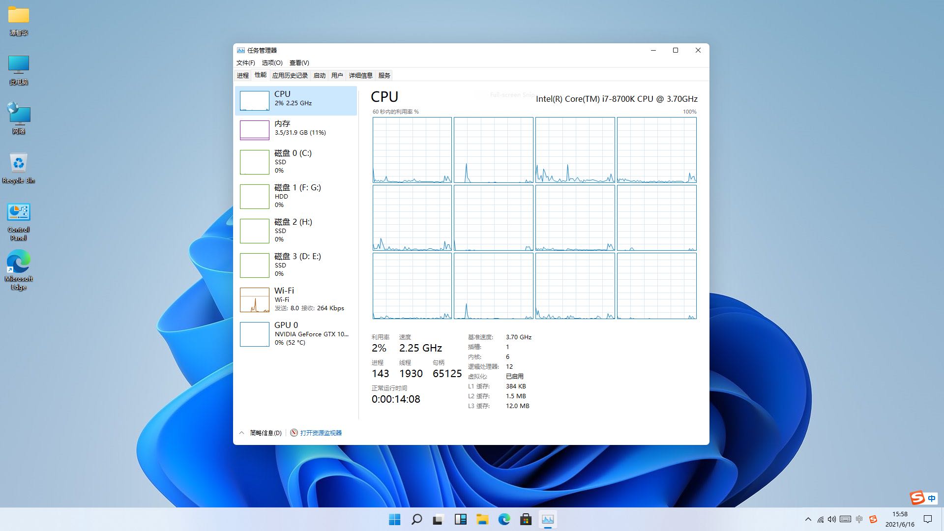 9.任务管理器查看各个主要硬件均能正常识别和工作。