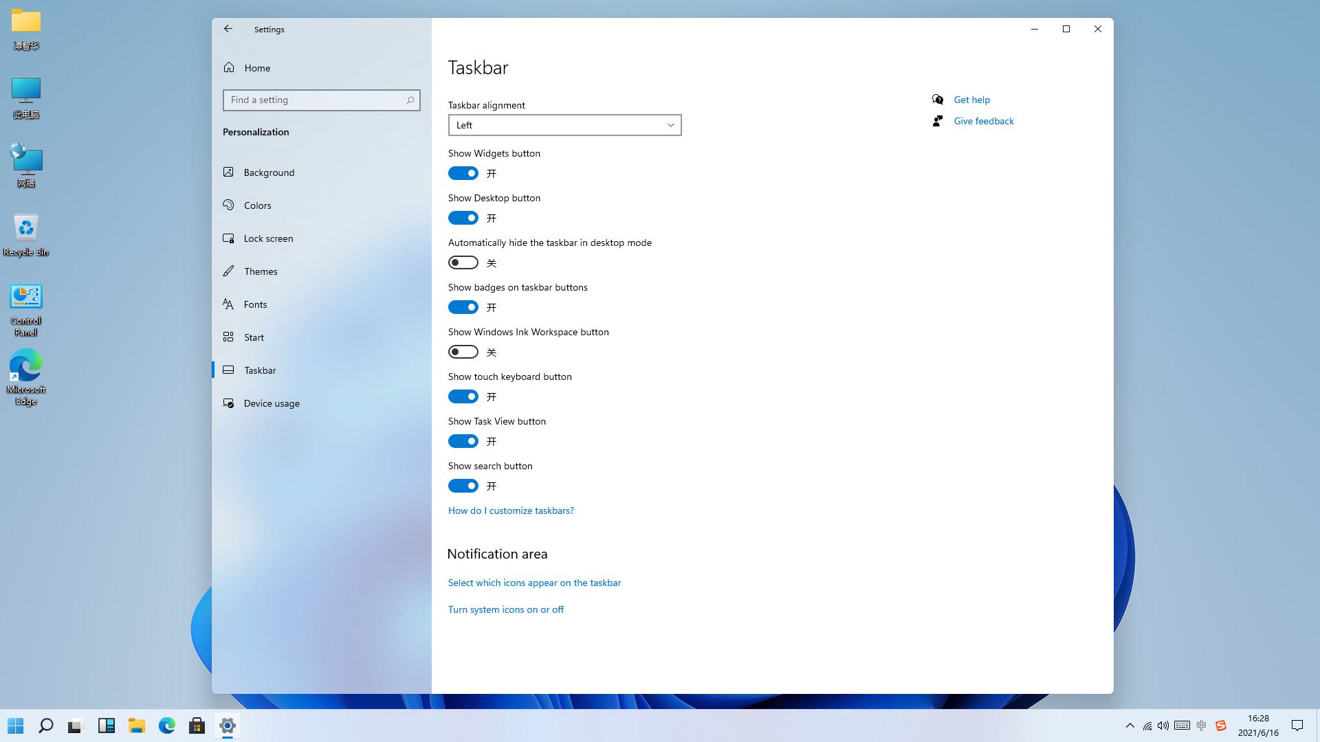 22.或者你可以设置底部任务栏图标左对齐,以延续上一代win10的使用习惯。