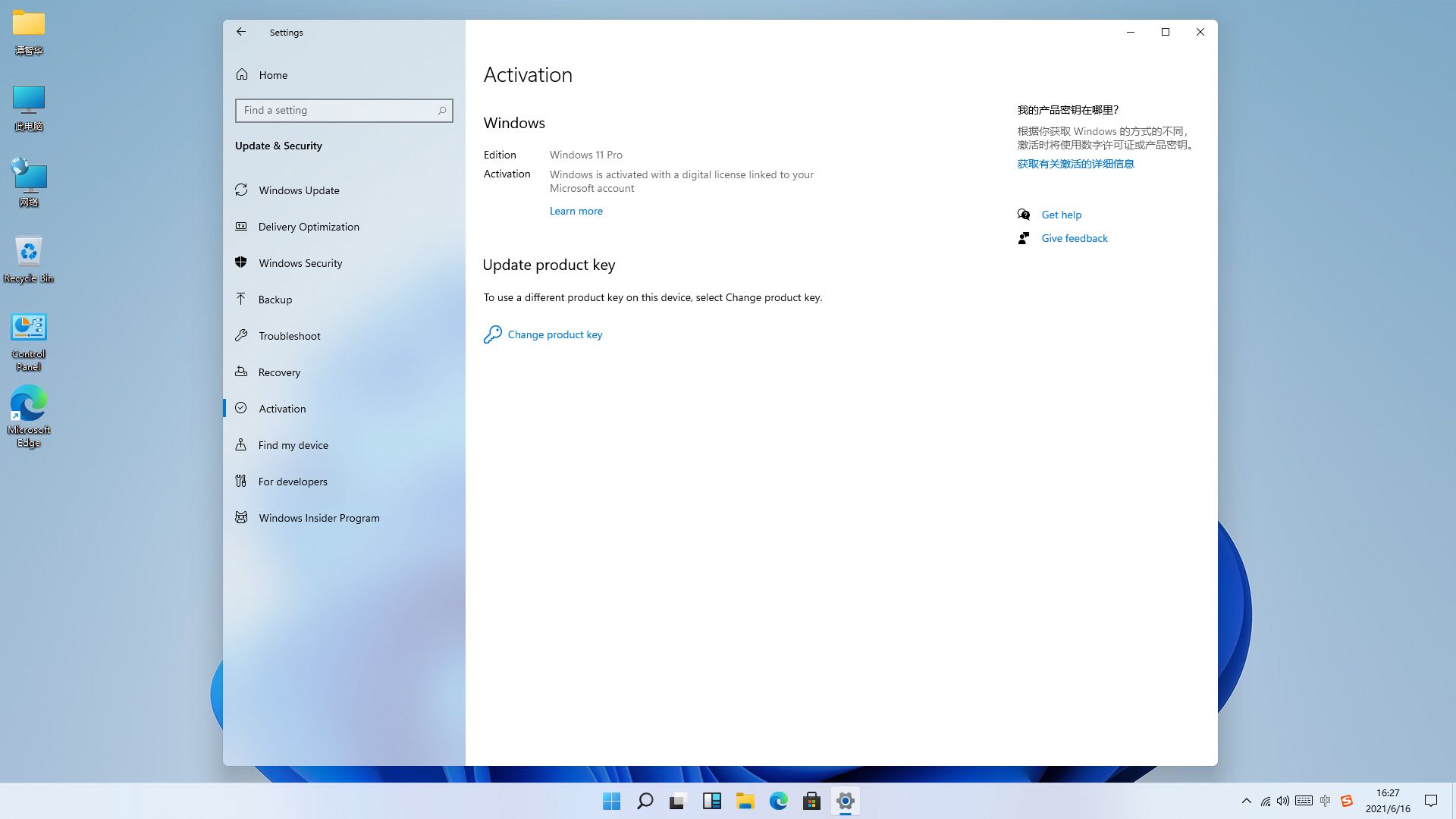 6.查看系统激活状态。 自动激活的需要满足两个条件 1.主机硬件未作改变。 2.微软账号绑定上一代win10对应版本的数字权利。