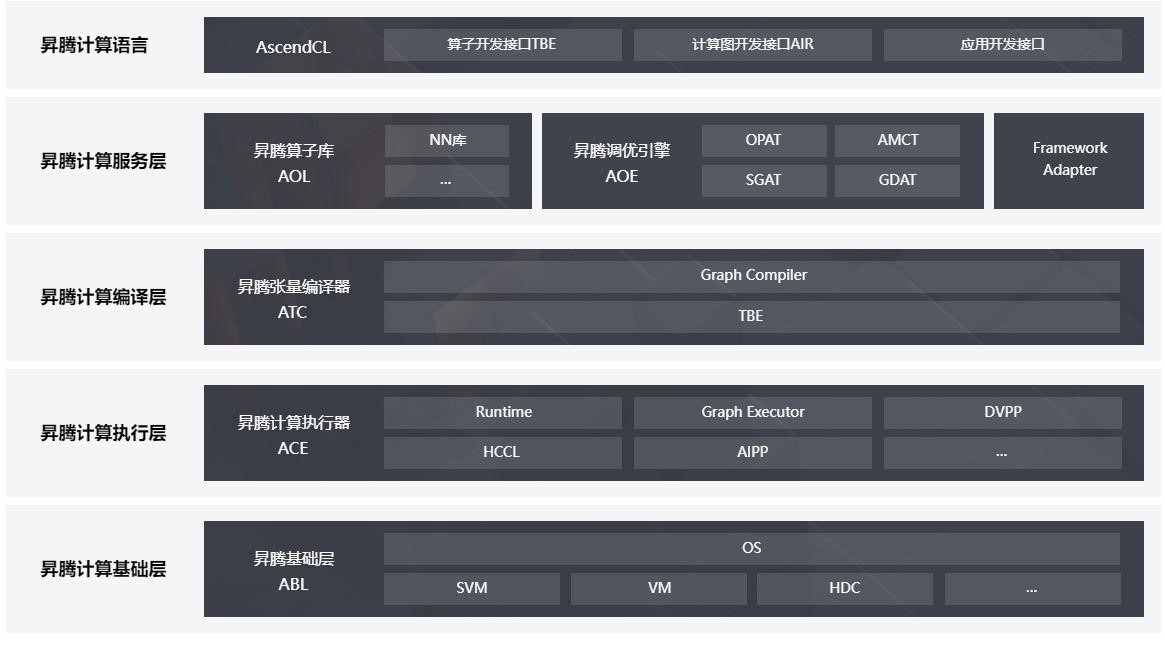本层主要提供昇腾计算库,例如神经网络(Neural Network,NN)库、线性代数计算库(Basic Linear Algebra Subprograms,BLAS)等;昇腾计算调优引擎库,例如算子调优、子图调优、梯度调优、模型压缩以及Al框架适配器。