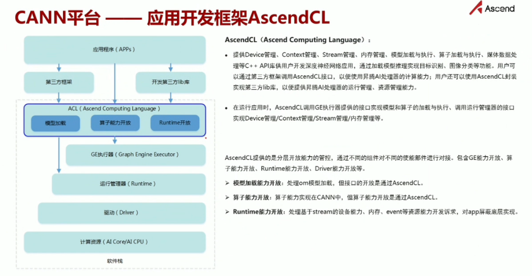 昇腾计算语言(Ascend Computing Language,AscendCL)接口是昇腾计算开放编程框架,是对低层昇腾计算服务接口的封装。它提供Device(设备)管理、Context(上下文)管理、Stream(流)管理、内存管理、模型加载与执行、算子加载与执行、媒体数据处理、Graph(图)管理等API库,供用户开发人工智能应用调用。
