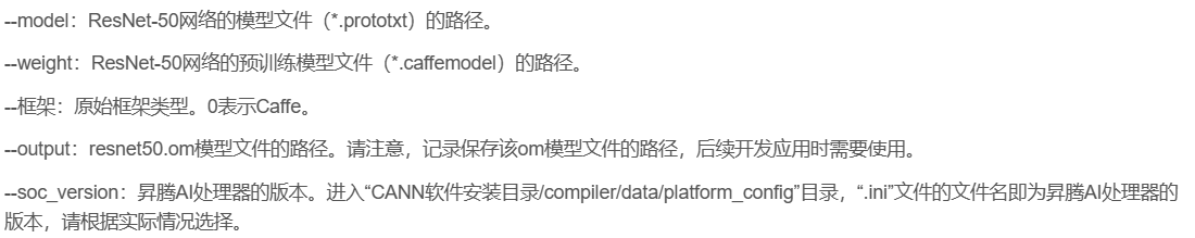 atc --model=model/resnet50.prototxt --weight=model/resnet50.caffemodel --framework=0 --output=model/resnet50 --soc_version=Ascend310