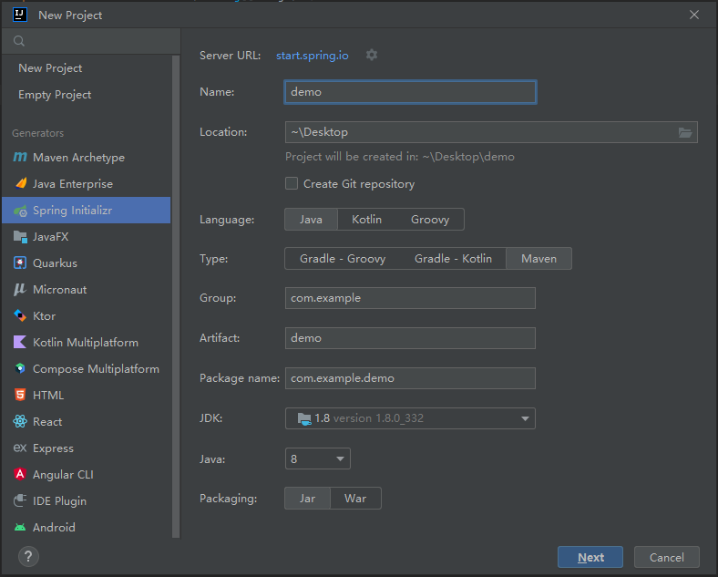 3. 点击next之后,初始构建器会让你选择一些依赖,我们选择直接创建。