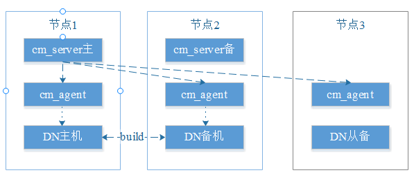 DN主备副本通过WAL实时同步数据,由集群管理(CM)来自动完成DN主备实例的状态监控、主备冲裁、主备切换及主备build。如果主DN所在机器发生故障,CM自动完成DN主备切换(备机升主,主机降备),如果故障恢复后,CM会自动做DN主备数据同步(build)来重建故障备机。