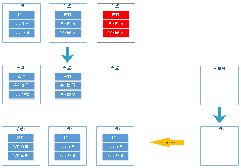 5、通过DWS修复工具gs_replace在新机器上重建故障机器上的软件、配置和数据。