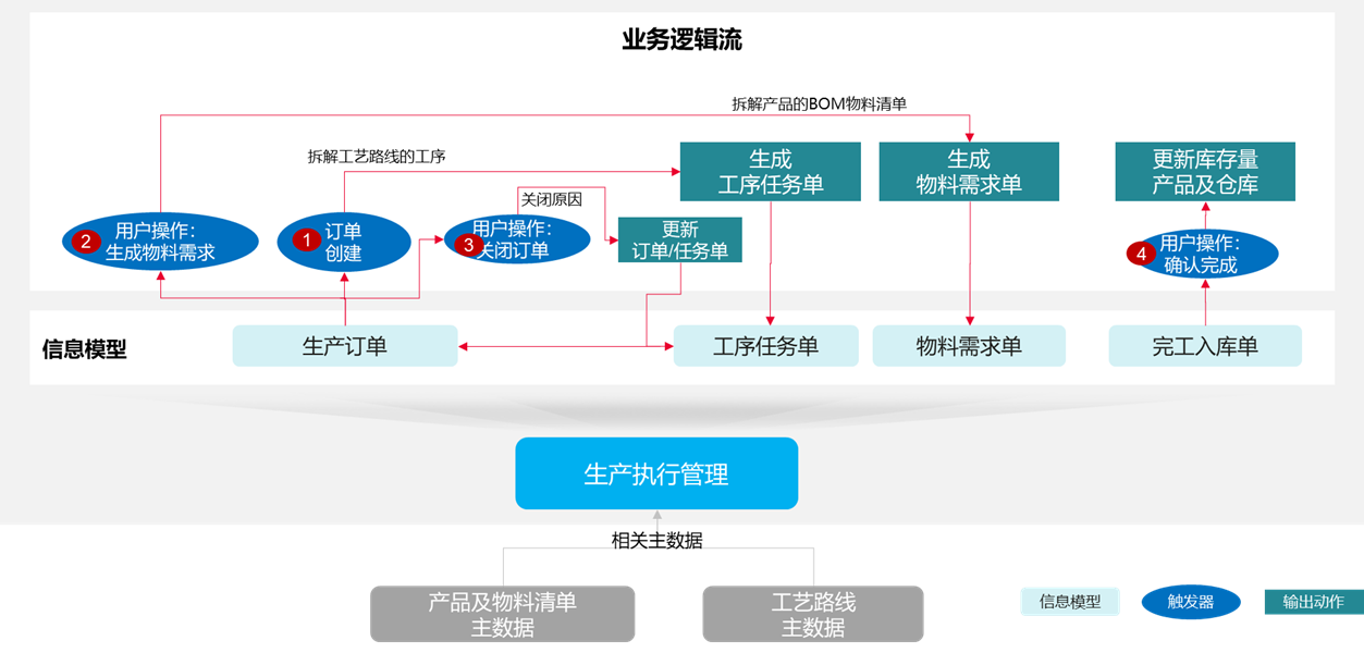 本期场景案例,需要通过实现以下4个业务逻辑流的编排与运行,来完成“生产执行管理”涉及的相关业务对象之间数据的按需自动流转: