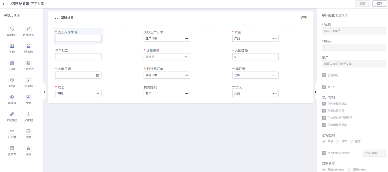“完工入库单”的信息模型字段的配置方法,请参考上期介绍的信息配置器的使用方法,这里不再展开说明。