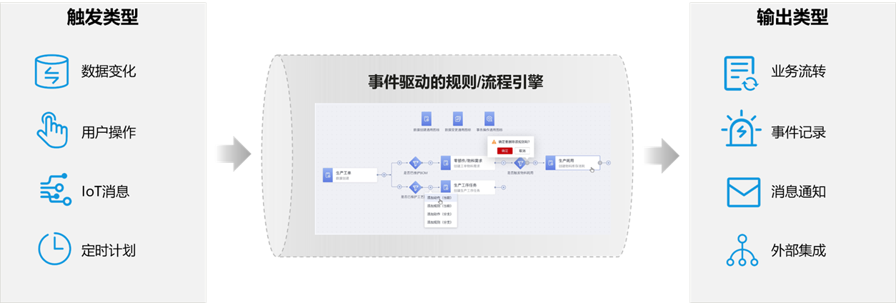 - 触发器:逻辑流引擎的触发源,支持以下四种触发器类型:数据变化(创建/变更)、用户操作、IoT消息和定期计划,能实时感知与响应业务数据/IoT设备数据的变化和用户的执行操作;