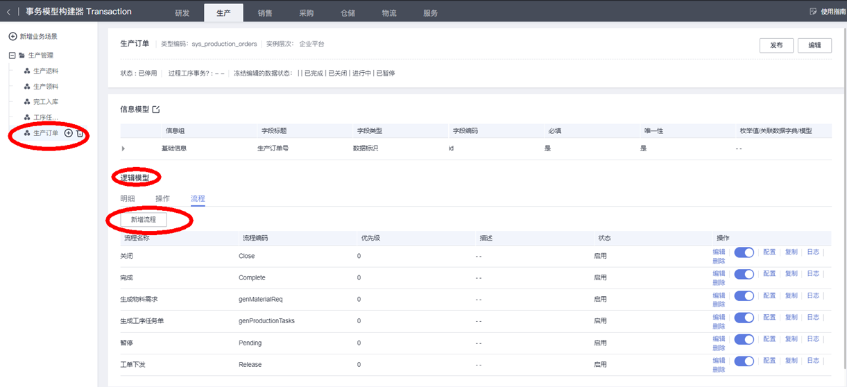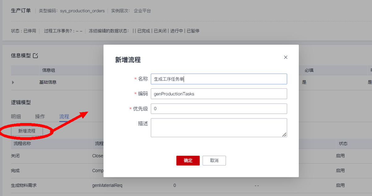 在“生产订单”模型的“逻辑模型”下,操作“新建流程”按钮,新增一个逻辑流 “生成工序任务单”: