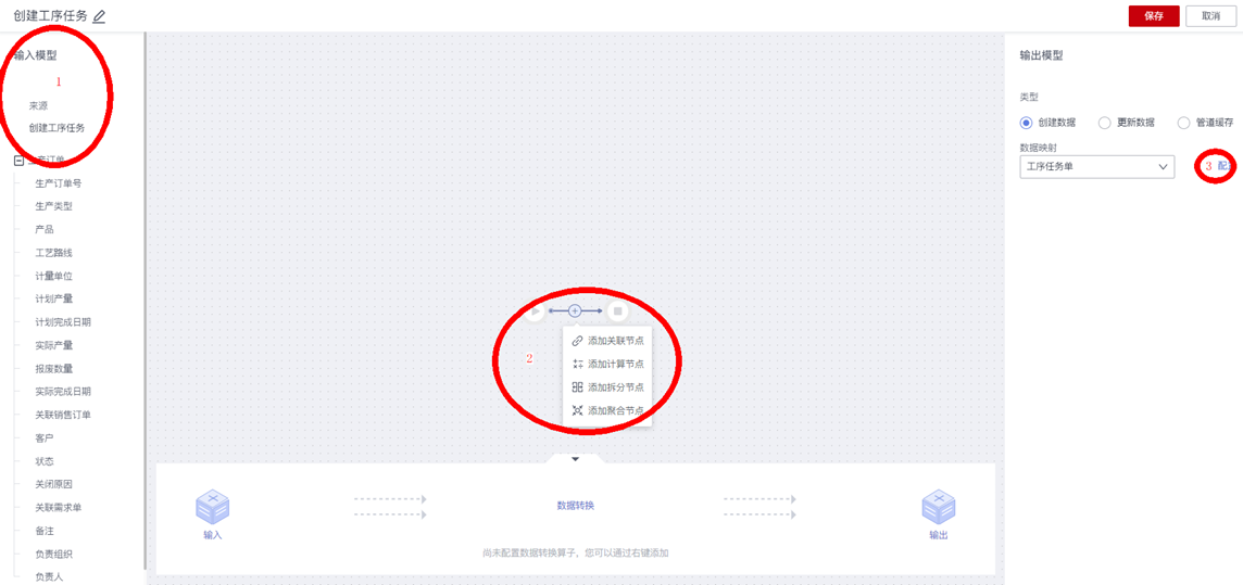- 源模型:从动作节点的输入数据或者前一个数据转换节点的输出数据中选择所需的模型作为关联转换节点的输入源数据,比如对于当前案例场景,“源模型”选择“生产订单”;