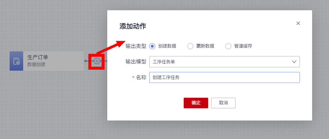 用户需要在创建“生产订单”后,自动根据生产订单的工艺路线来拆解后,创建相应的工序任务单数据,则“输出类型”选择“创建数据”,输出模型选择“工序任务单”,最后填写一个有业务含义的动作名称“创建工序任务”: