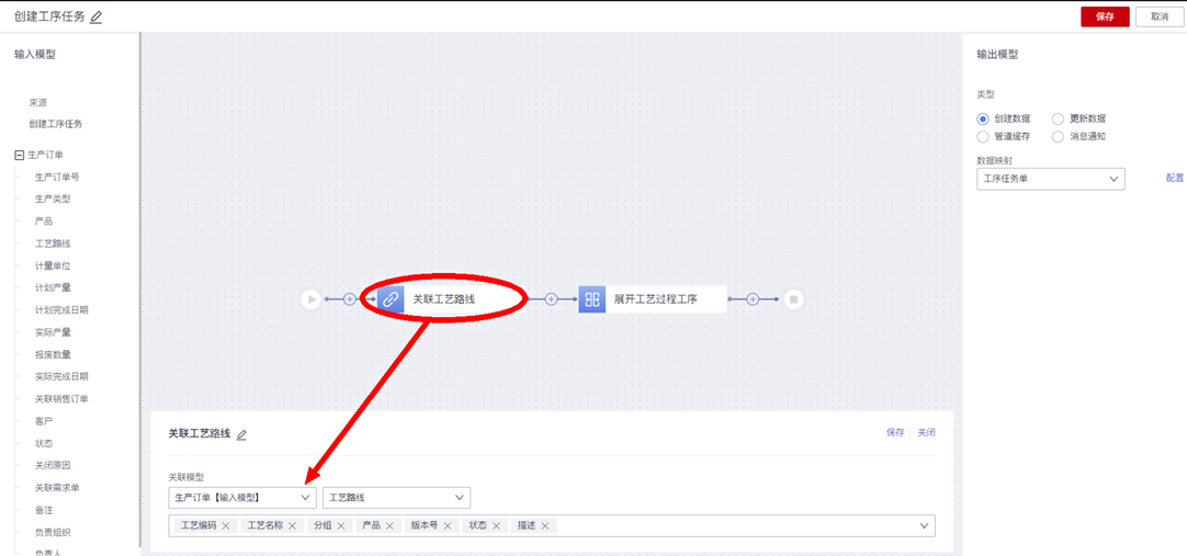 - 逻辑流的输入模型(即触发对象,比如“生产订单”),以及过程处理后的管道中模型(比如生产订单在逻辑流动作节点中关联了“产品”、“工艺路线”等模型);