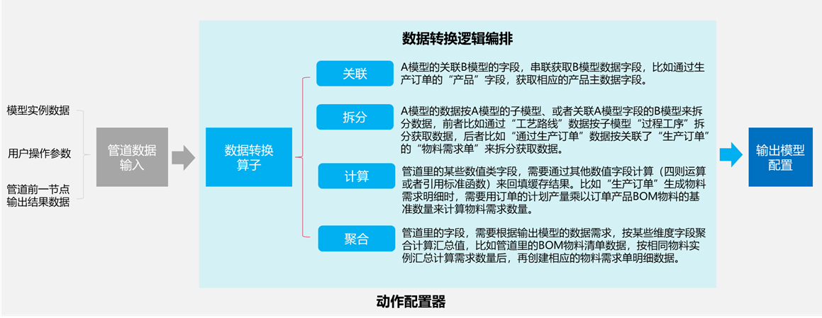 根据实际业务需求,灵活组合编排4类数据转换算子节点,实现对动作节点的输入数据进行数据转换加工,以满足当前动作节点最终输出的数据结果需求