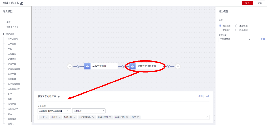 通过“动作配置器”编排动作节点“创建工序任务”的“数据转换逻辑”后,获得满足创建输出模型“工序任务单”数据所需的工艺路线和过程工序数据后,最后按需映射配置“输出模型”的字段值。
