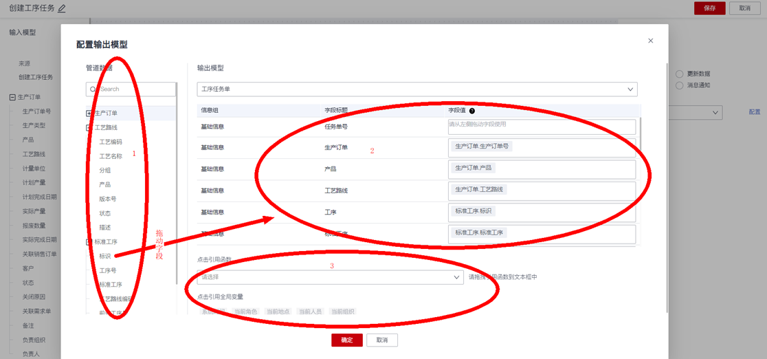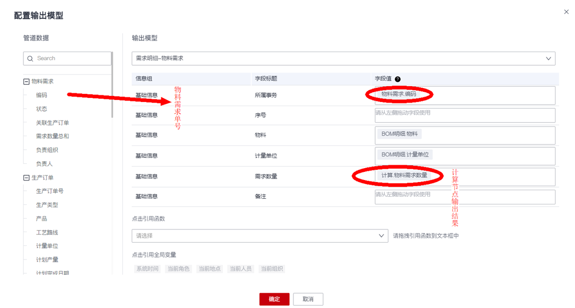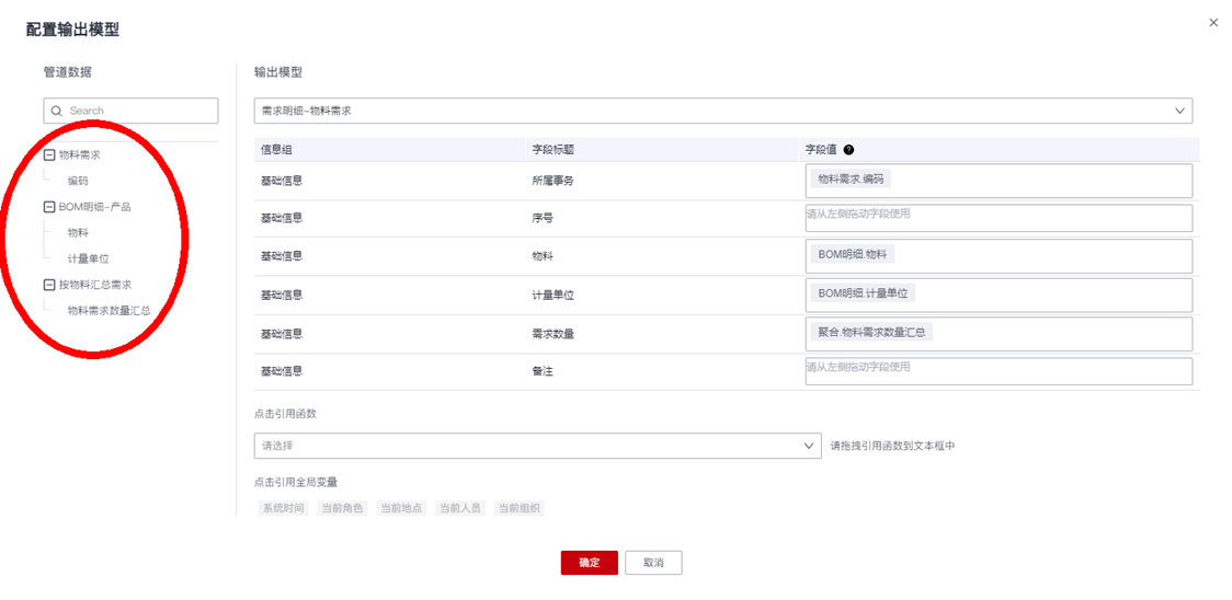 - 引用系统全局变量:平台内置了一些系统全局变量,比如系统时间、当前登录人员、当前人员组织等,支持拖动某个全局变量映射到某个输出模型字段。