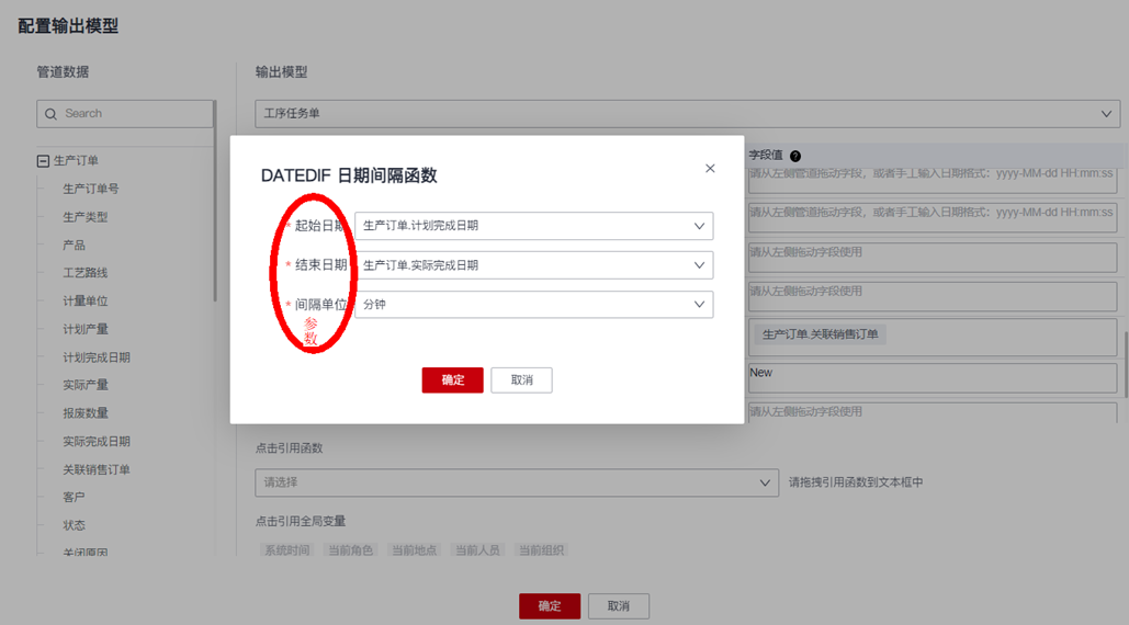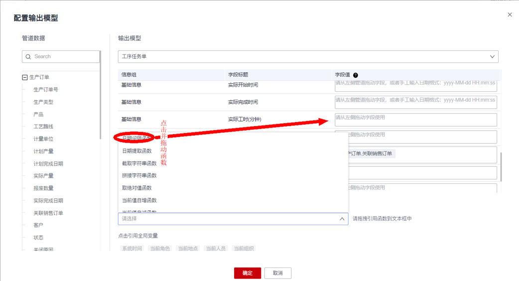 - 引用标准函数计算:平台内置了一些常用的数据计算函数,用户可根据业务需求,点击并拖动某个函数到某个输出模型字段,然后配置函数所需的参数值(参数支持选择引用管道中的某个字段值或者输出模型的某个字段值),以“计算实际工时”来举例,可引用“日期间隔函数”拖动到“工序任务单”的“实际工时(分钟)”字段: