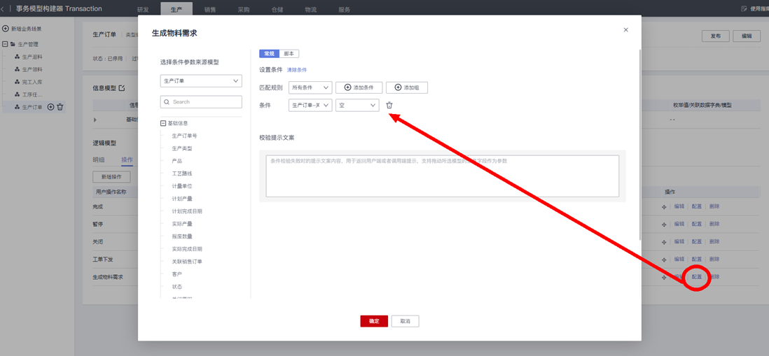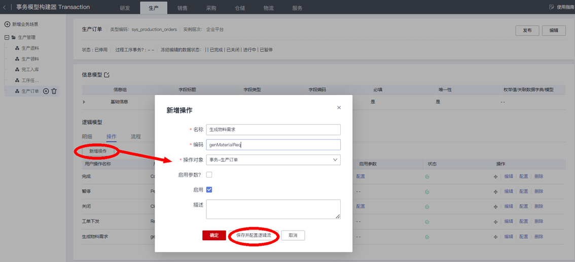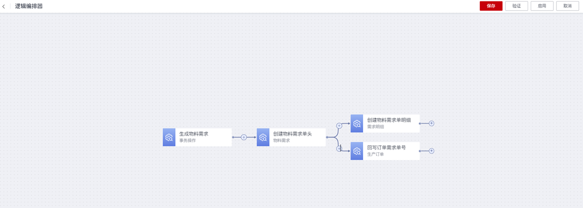 至此,完成了 “操作生产订单,生成物料需求单”业务逻辑流的建模配置。