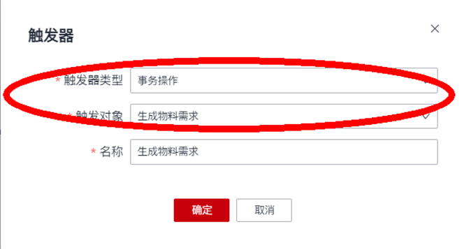 在新增的“生成物料需求”操作的配置窗口,可选择“保存并配置逻辑流”,快速创建一个由用户操作触发执行的逻辑流,也可以先确定保存“用户操作”,后续在新增逻辑流的触发器配置中绑定“用户操作”: