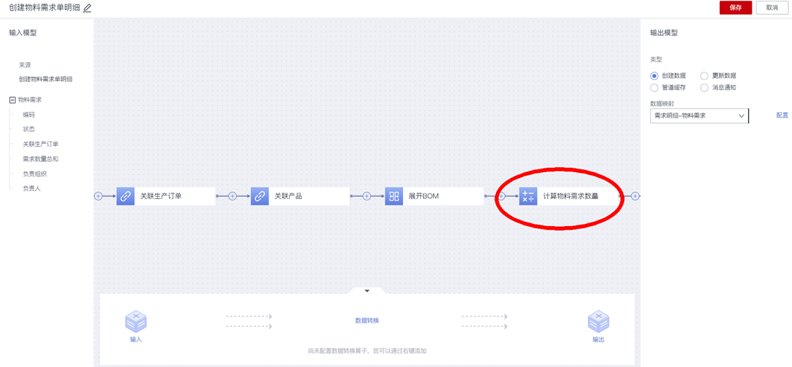满足此需求,需要在“创建物料需求单明细”的动作节点的“数据转换逻辑”中使用到“计算节点”: