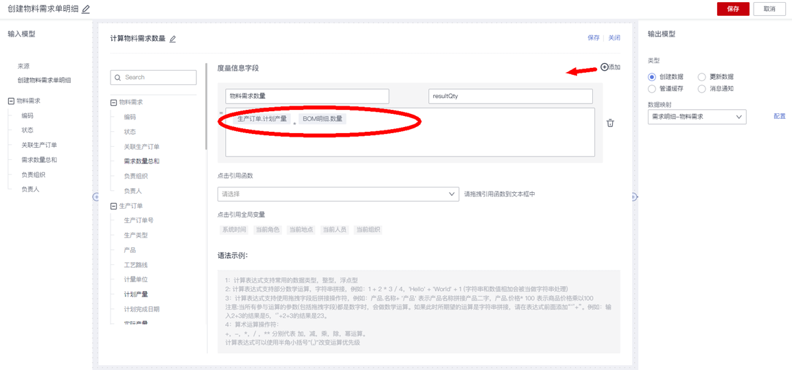 点击“度量信息字段”右侧的“添加”按钮,添加一个计算字段“物料需求数量”,依次配置:计算字段名称、计算字段编码,然后编辑计算公式:从左侧数据管道中拖入“生产订单”的“计划产量”字段和“BOM物料清单”的“数量”字段作为计算参数,然后在中间输入乘号“*”运算符。计算公式支持“+-*/”加减乘除四则运算符,支持点击拖动引用标准函数计算。