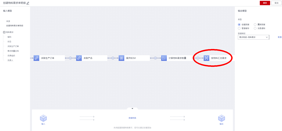 需要将前序转换节点输出的物料清单数据,按相同物料编码汇总需求数量后,再生成相应物料需求明细数据。