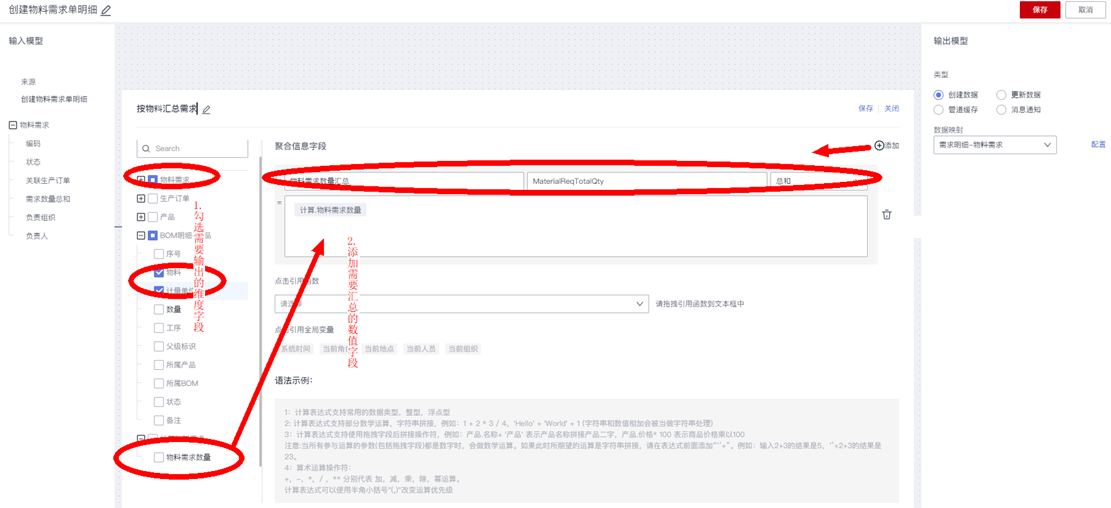 在“创建物料需求单明细”的动作节点,需要在“数据转换逻辑”中使用到“聚合算子节点”: