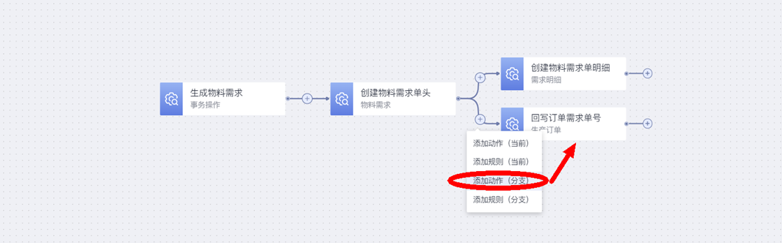 在“创建物料需求单”动作节点后,点击“添加动作(分支)”,新增一个与“创建物料需求单明细”动作节点并行的分支节点“回填订单需求单号”: