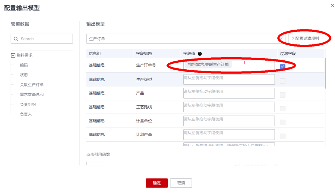 - 如果数据管道中存在输出模型的“数据标识”字段(比如物料需求单的“编码”),则拖动映射到输出模型的“数据标识”字段值,并勾选“过滤字段”,通过“数据标识”值,来确定需要更新输出模型的具体数据实例;