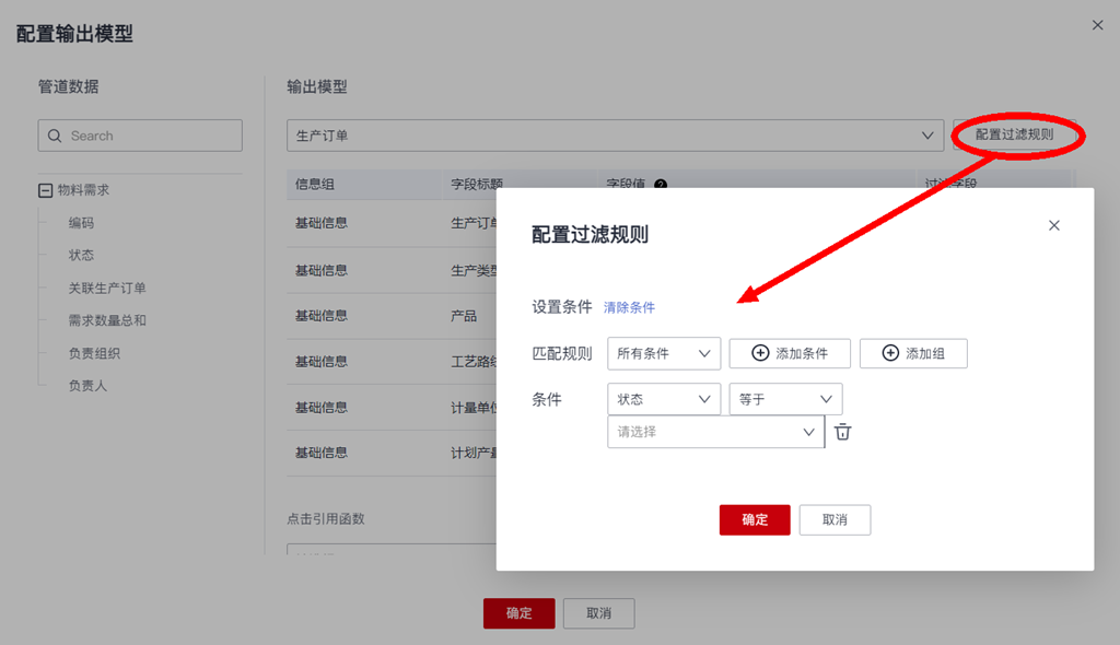 - 如果是需要组合一定的字段条件来确定目标更新的输出模型数据范围,则拖动所需的数据管道字段映射到输出模型的相应字段值并勾选“过滤字段”,以及通过“输出模型”选框右侧的“配置过滤规则”来组合设定输出模型的目标数据过滤条件: