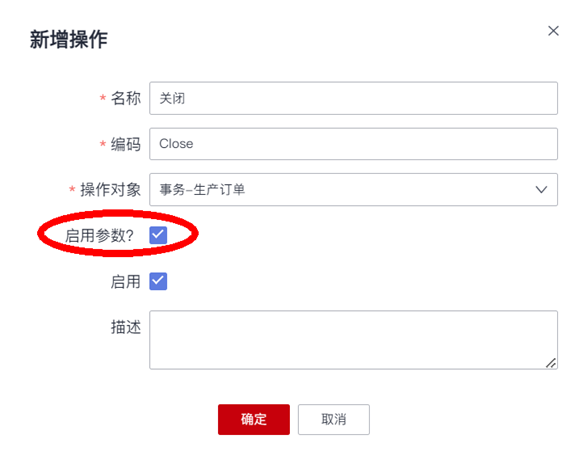 - 启用参数:配置用户在前端界面使用操作时,是否需要输入一些参数信息,比如下一个案例中“关闭生产订单”操作,需要用户输入“关闭原因”。在下一个案例中,详细介绍用户操作的“参数”的配置方法;
