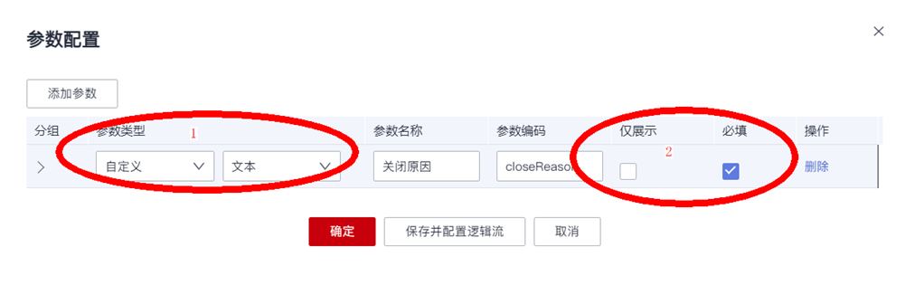 针对“关闭订单”操作,我们添加一个“自定义”类型的参数,字段类型选“文本”,然后填写参数在前端显示的名称,以及用于后台传递的“参数编码”,最后勾选“必填”,完成参数配置。