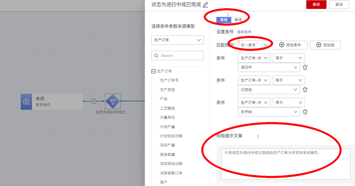 针对“关闭订单”的规则节点,“匹配规则”选择“任一条件”,然后添加三个条件,依次配置“生产订单”的状态字段允许满足的三个状态值:“进行中”、“已完成”和“未开始”。