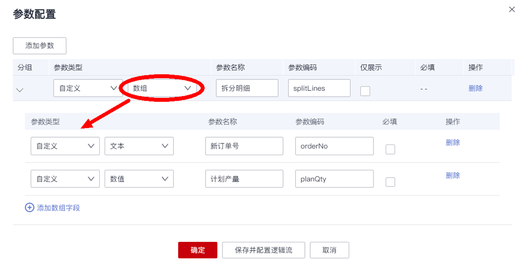 - 自定义:选择参数的字段类型,支持数值、文本、日期、时间和数组,其中“数组”类参数,用来满足这类业务需求:用户在执行操作时,需要填写多行数据作为输入信息,比如对于生产订单拆分为多个订单的需求场景,需要定义一个数组类的参数来承载需要拆分成多个订单信息。