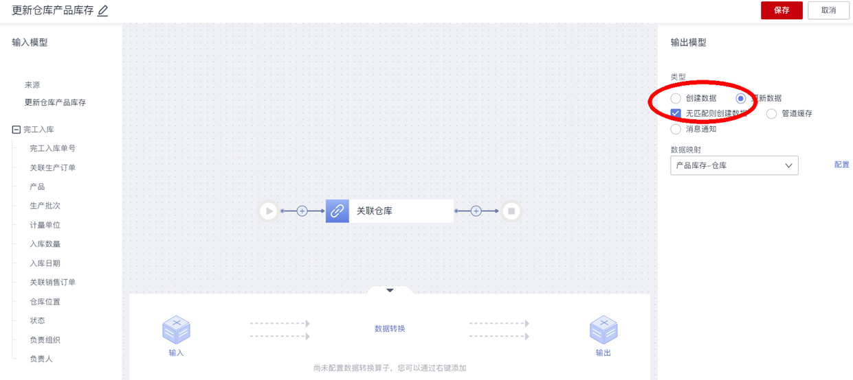 - 输出类型选择“更新数据”,并且勾选“无匹配则创建数据”:因为在某产品第一次入库到某个仓库时,仓库下不存在该产品的库存现有量数据(即“仓库”空间位置模型的子模型“产品库存”中不存在该产品库存的数据实例),那么第一次入库是创建相应的产品库存数据,后续的完工入库操作则是更新相应的产品库存数据,所以针对这种业务场景,需要勾选“无匹配则创建数据”。