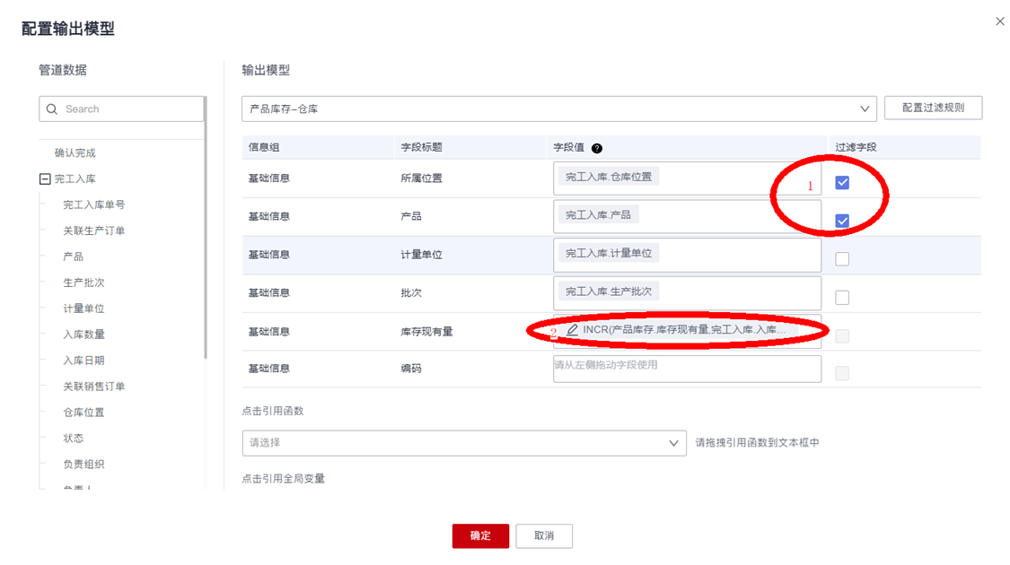 - 配置输出模型“仓库-产品库存”的字段映射“完工入库单”的“仓库位置”和“产品”字段值,并勾选“过滤字段”,来匹配“仓库-产品库存”模型的目标数据。最后引用标准函数“当前值自增函数”来计算得到完工入库后的“库存现有量”: